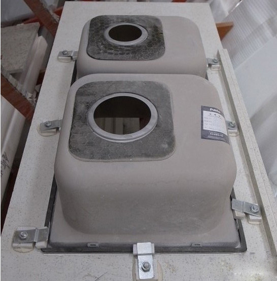 第二、水盆和臺面間的臺面膠處理工藝(由液體涂抹,它會冷卻固化后,起粘結和定位作用,粘牢后用手掰都掰不下來)。