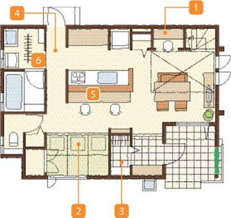 這個布置適合大玄關。對于較小的玄關,有如下方式縮減流線距離,使布局更緊湊。