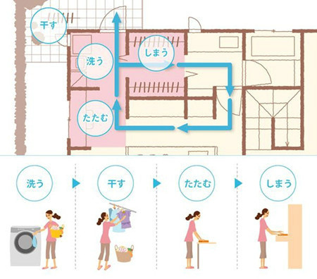 設計的時候就充分考慮從洗衣到晾曬空間到折疊到收納的流線,例如圖中的布局,洗衣房連著陽臺,洗完可以直接拿出去曬,收回來疊好直接放進服裝的儲藏室。