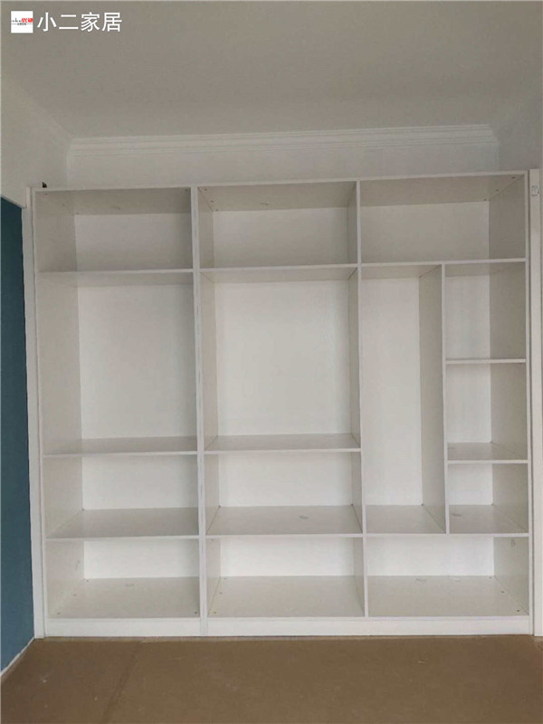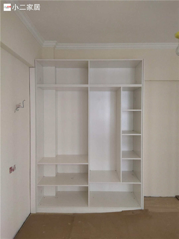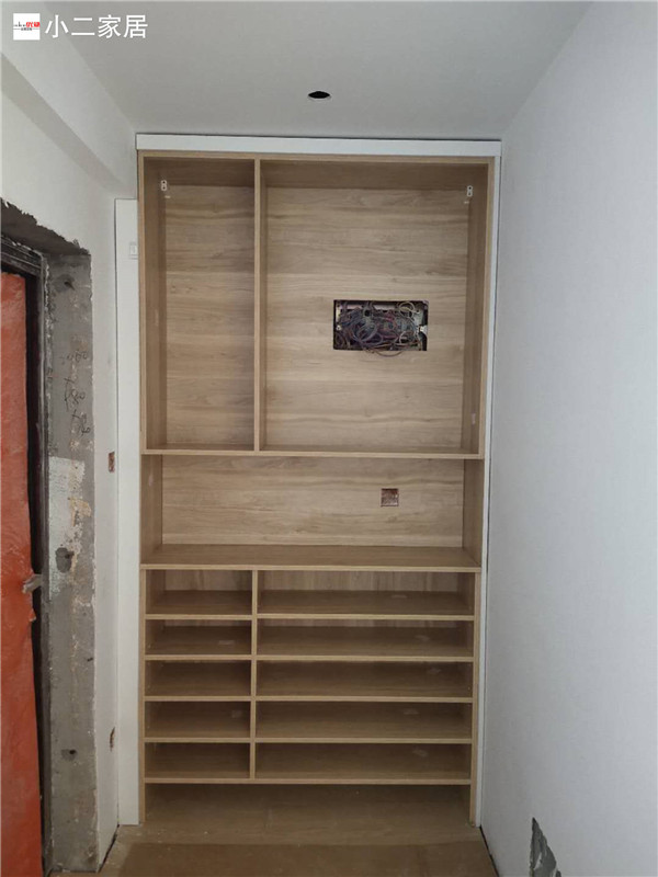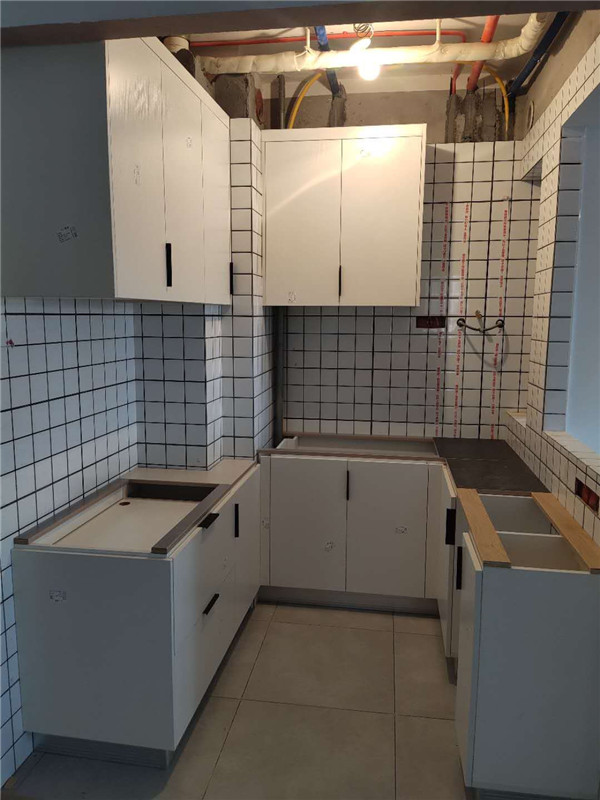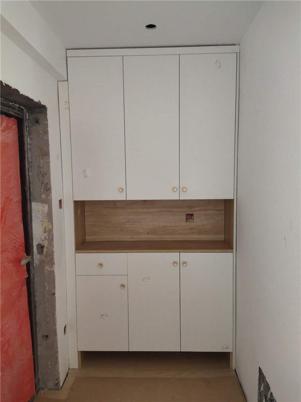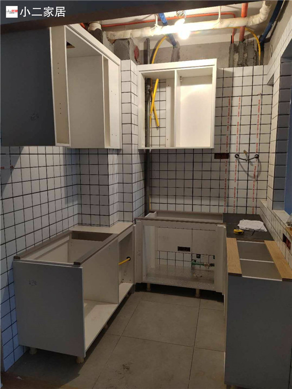 經(jīng)過師傅兩天努力,柜體拼裝好都固定起來了,業(yè)主家柜體以原木色與白色為主,