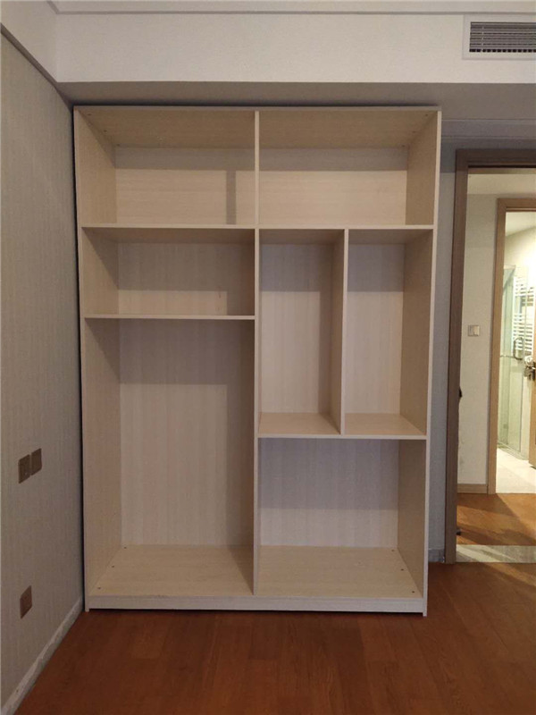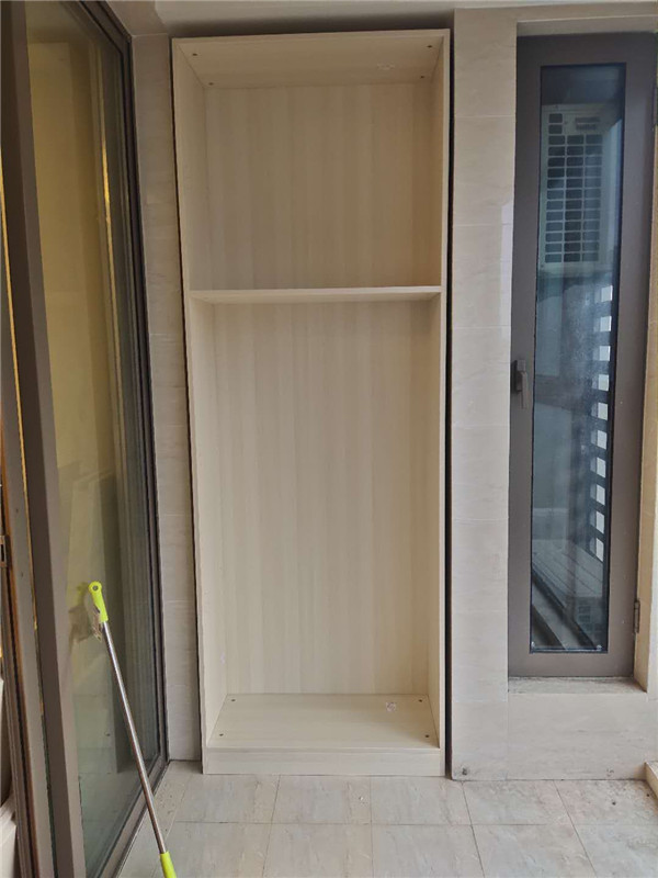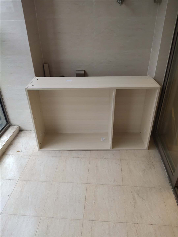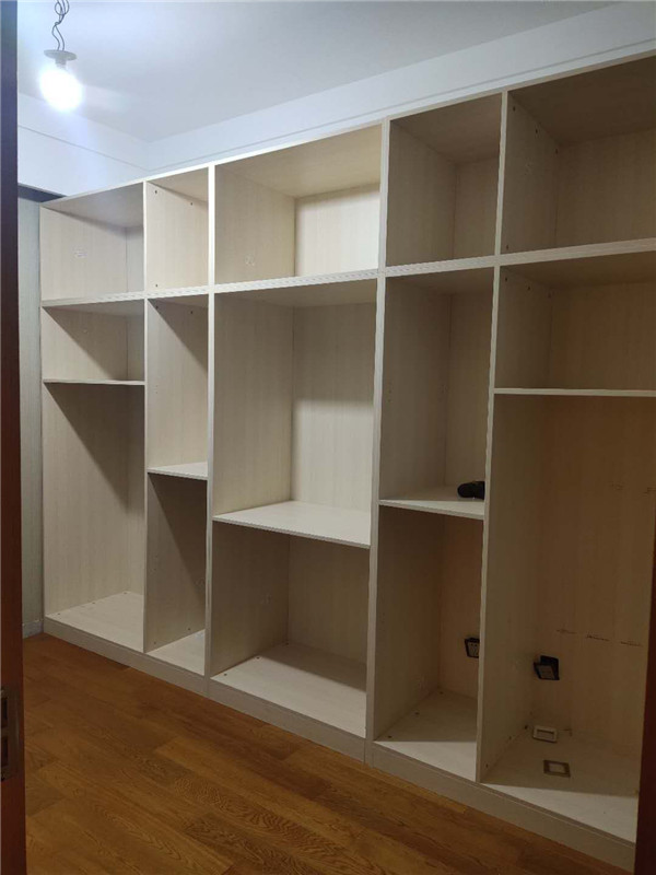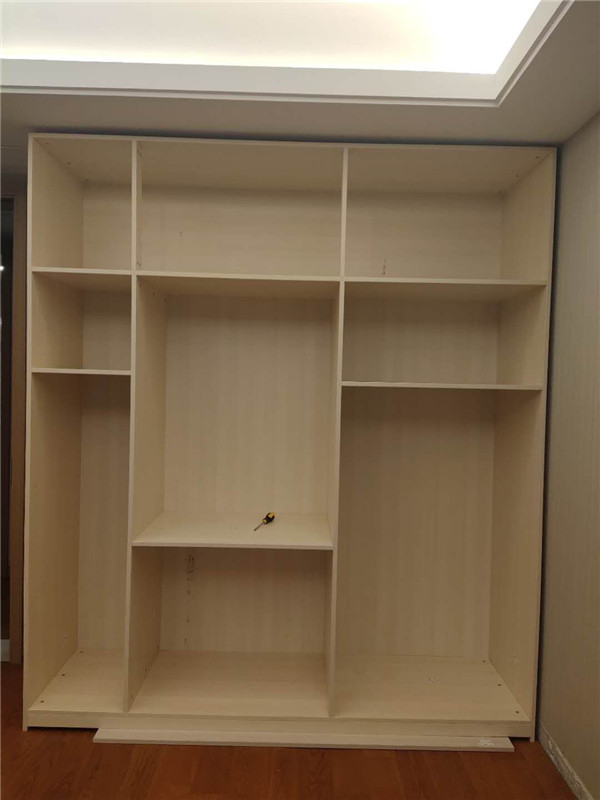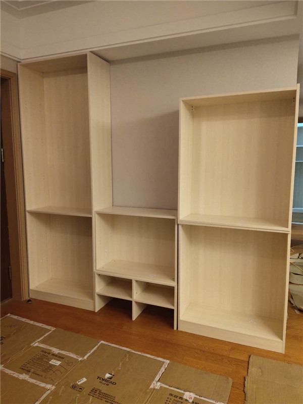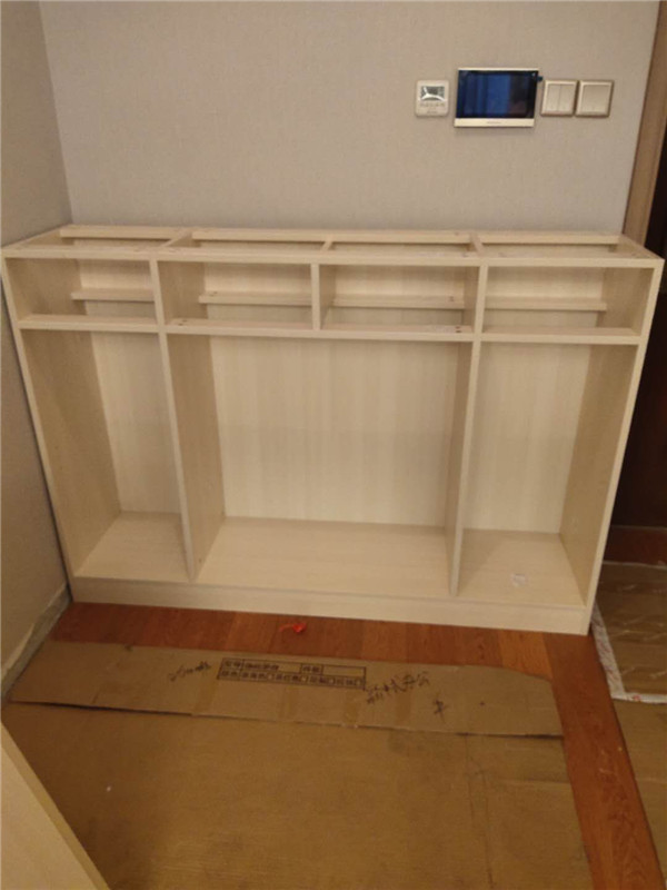 柜體差不多拼裝完畢,豎起來了,業主家柜體選擇的淺色系,整體效果清爽干凈,期待柜門安裝后的效果。
