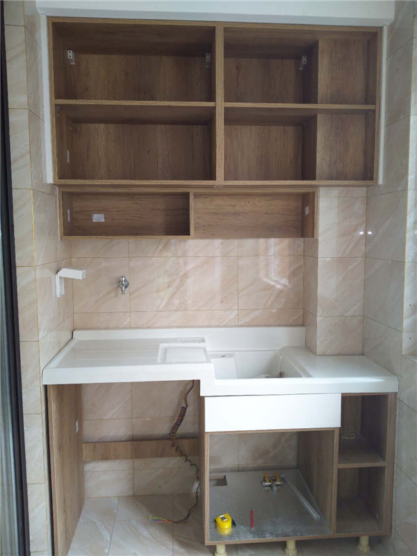 房水槽、灶具、浴柜臺盆放置在現場,后期臺面安裝需用到。柜子安裝好后進入臺面