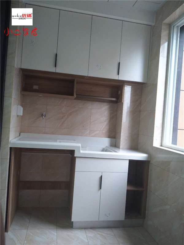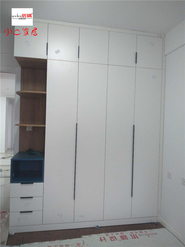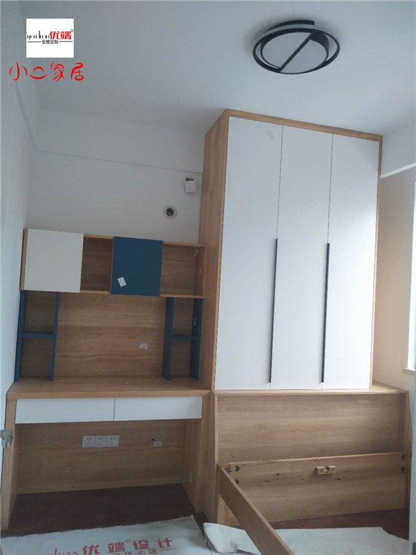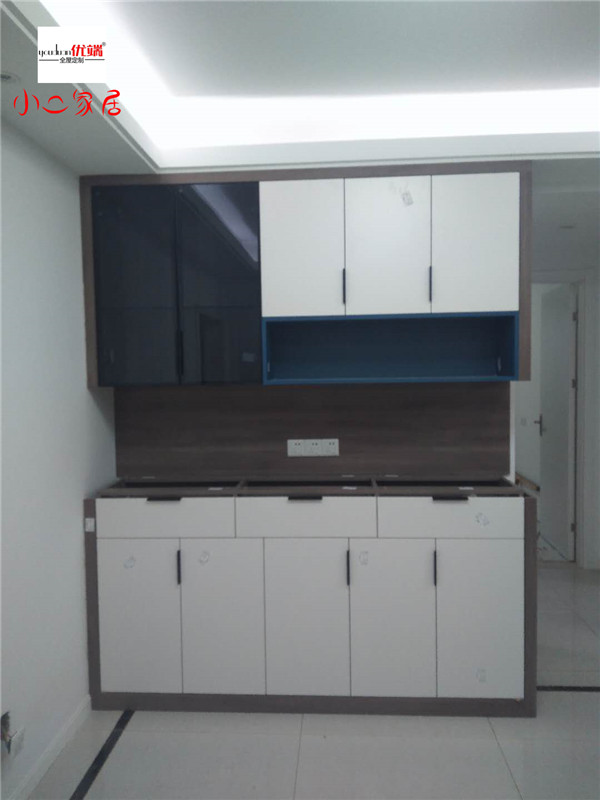 柜子都安裝完畢了,客戶家選的顏色比較統一,白色配原木色顯得整體舒適有層次感,配上深藍色的套色格瞬間提升整體的檔次。