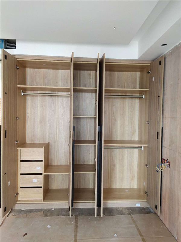 門板選用的是平安樹進口雙飾面百慕威的天使本橡。衣柜拉手選用
