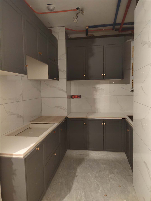 水槽下面鋪有錫紙,不用擔心落水下去把板材給泡壞了。業主家能做柜子的地方都做上柜子了,后期收納足足的了。