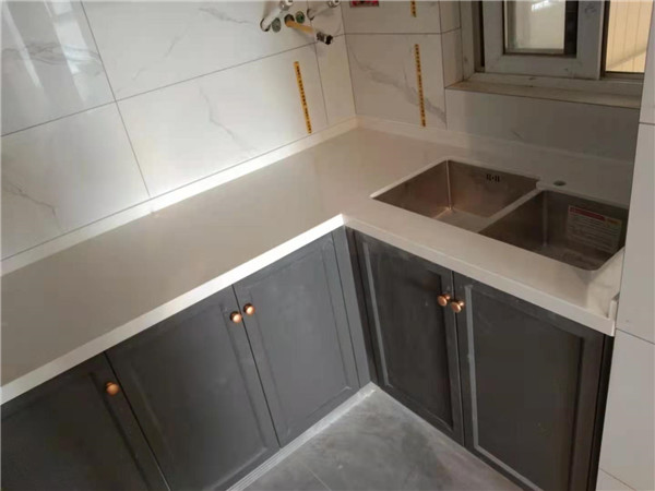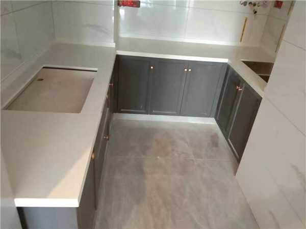 安裝臺面啦,櫥柜門板選用了深色的,所以臺面用淺色的石英石來搭配,看著很清爽。