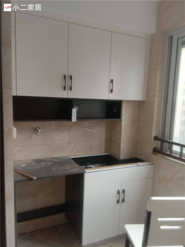 到的廚房水槽、灶具、浴柜臺(tái)盆放置在現(xiàn)場,后期臺(tái)面安裝需用到。柜子安裝好后進(jìn)入臺(tái)面