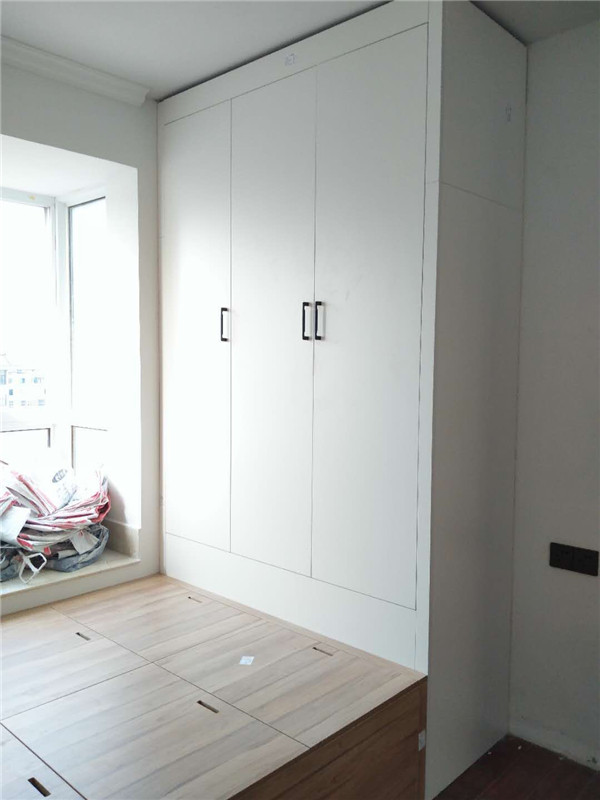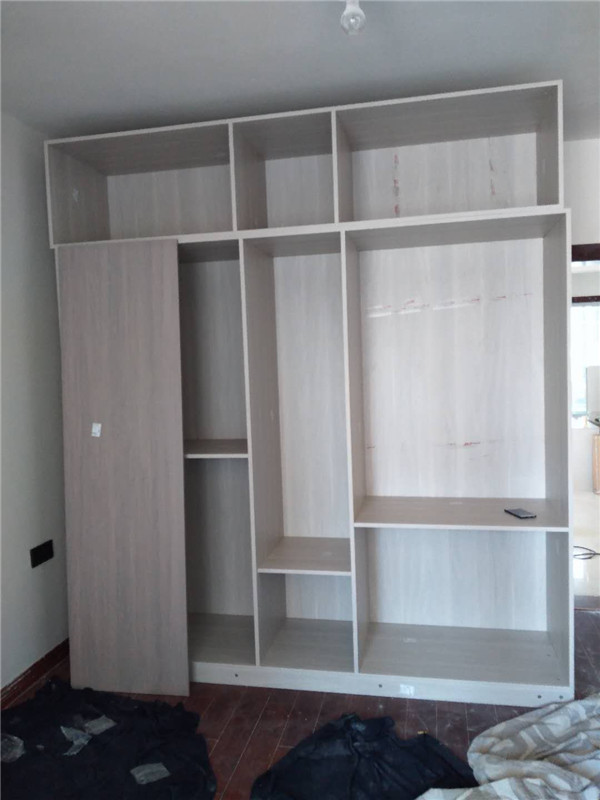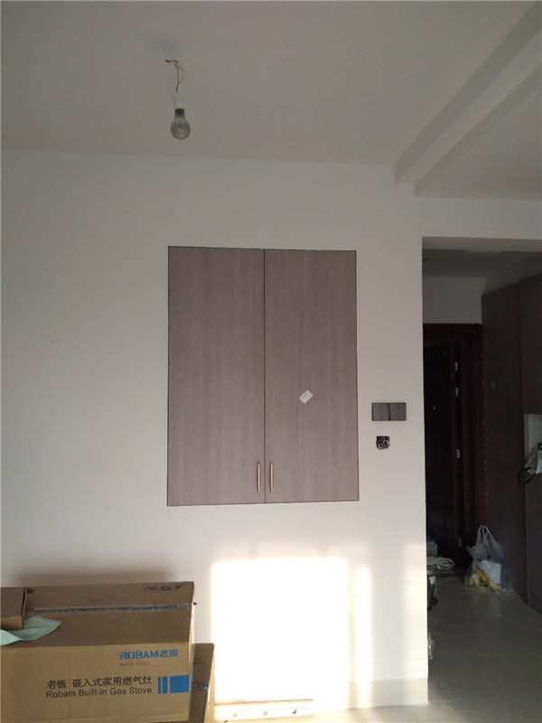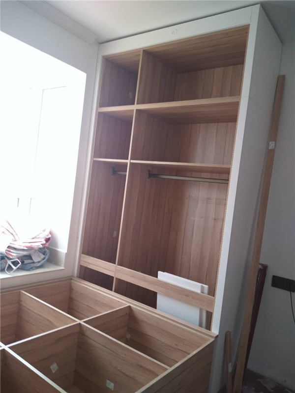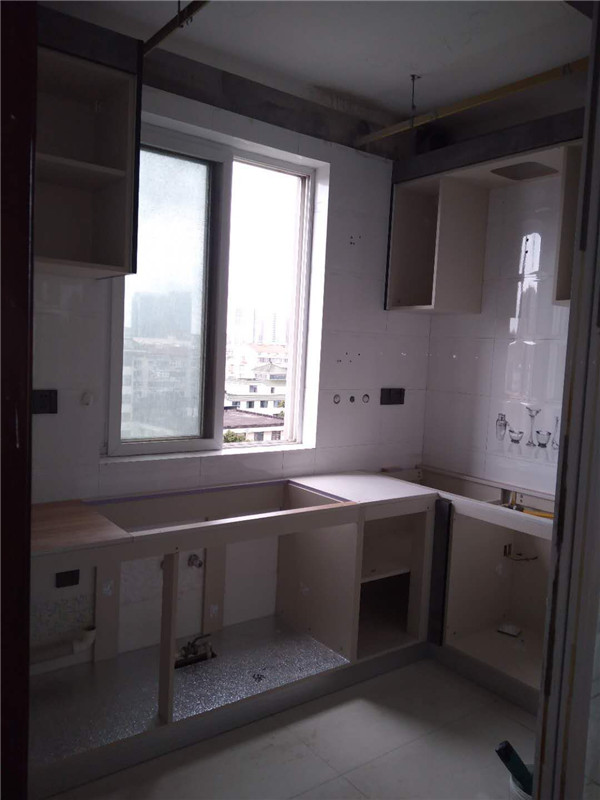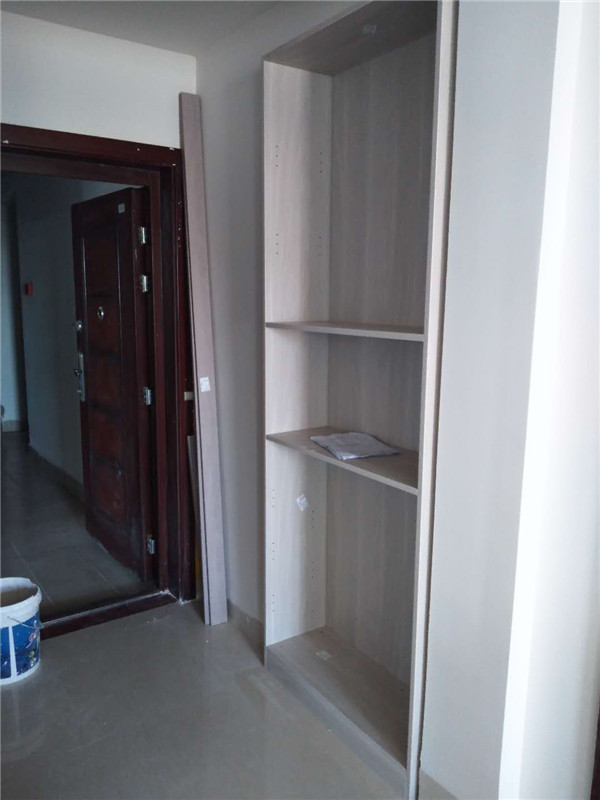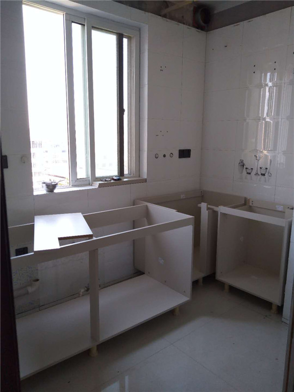 熱騰騰的圖片來了,柜子部分已拼裝完畢,還未固定,業主家柜體采以淺色調為主,