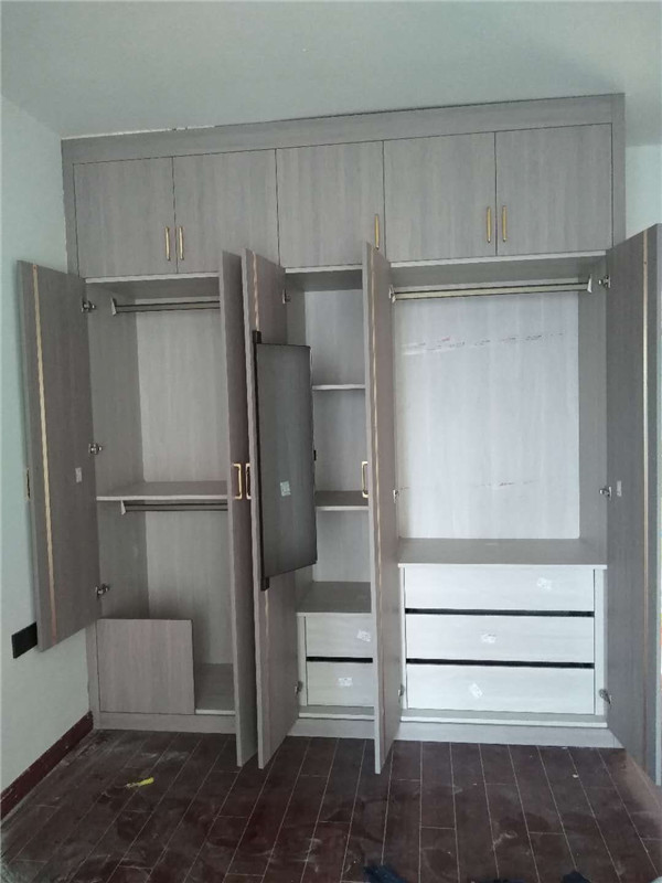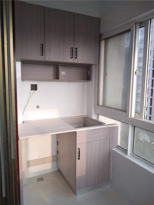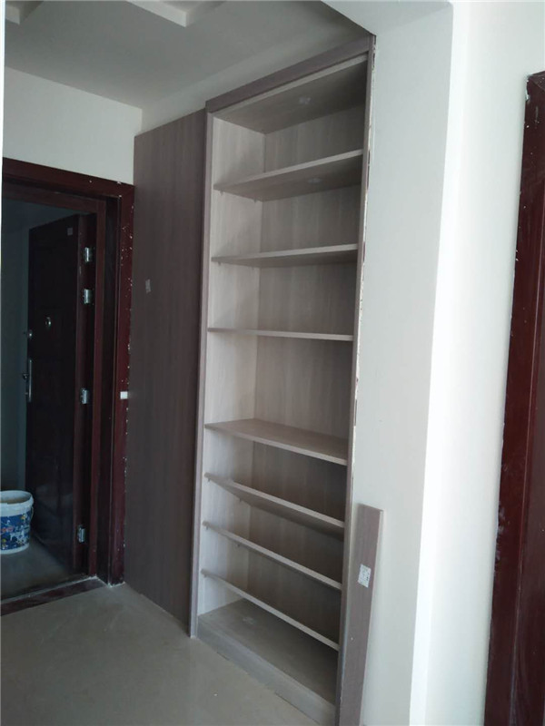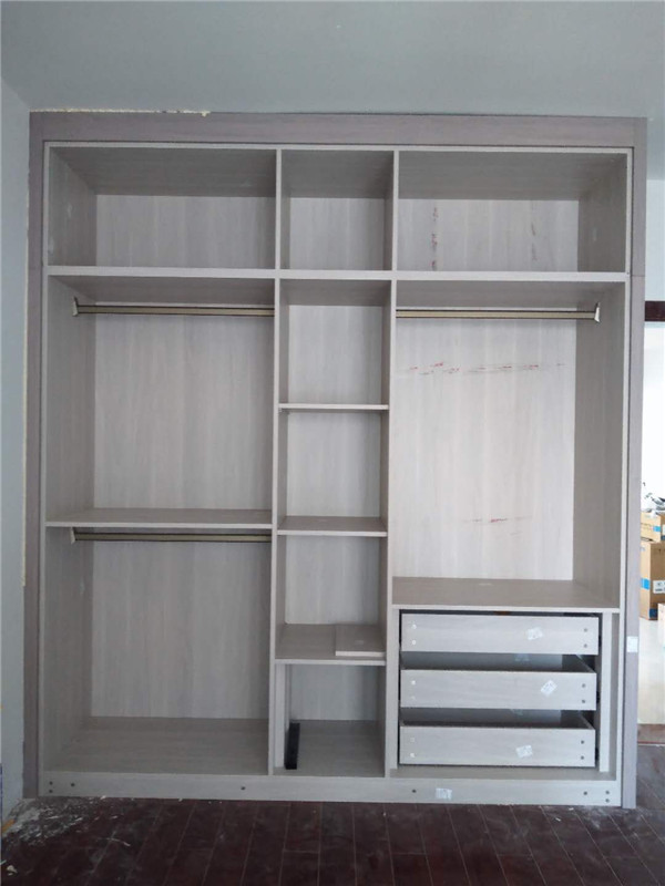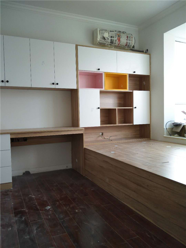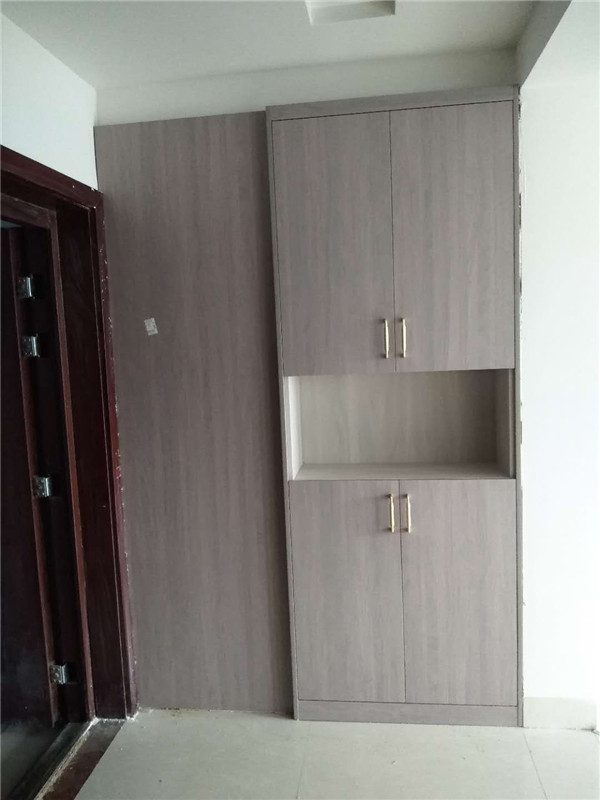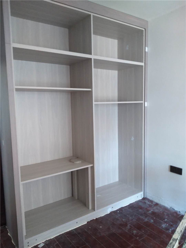 熱騰騰的圖片來了,柜子部分已拼裝完畢,還未固定,業主家柜體采以淺色調為主,