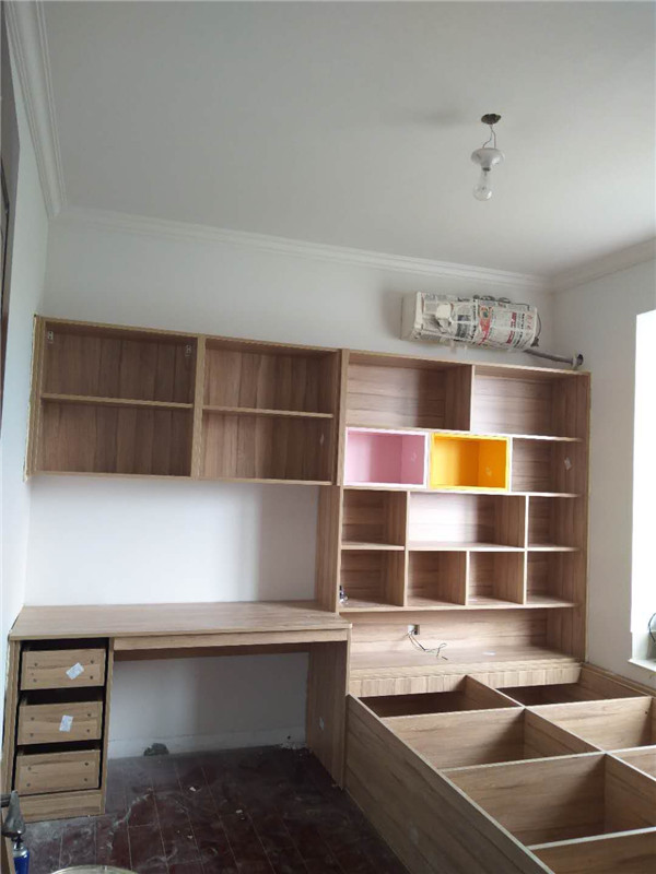 柜子最新進展,柜體全部拼裝完畢,固定起來了。榻榻米房一邊做了書柜加書桌另外一邊做了衣柜,美貌收納兩不誤,采光也是足足的。
