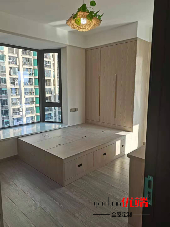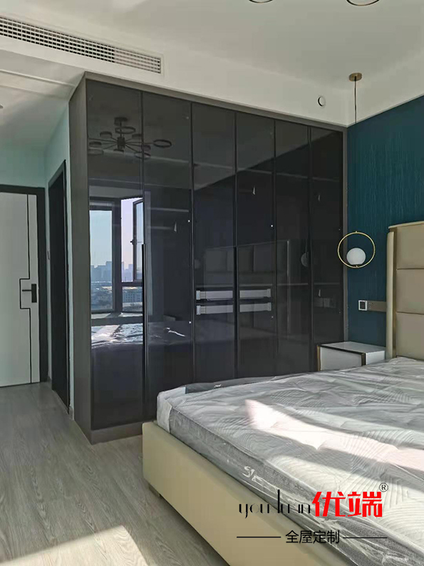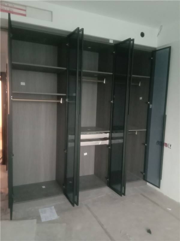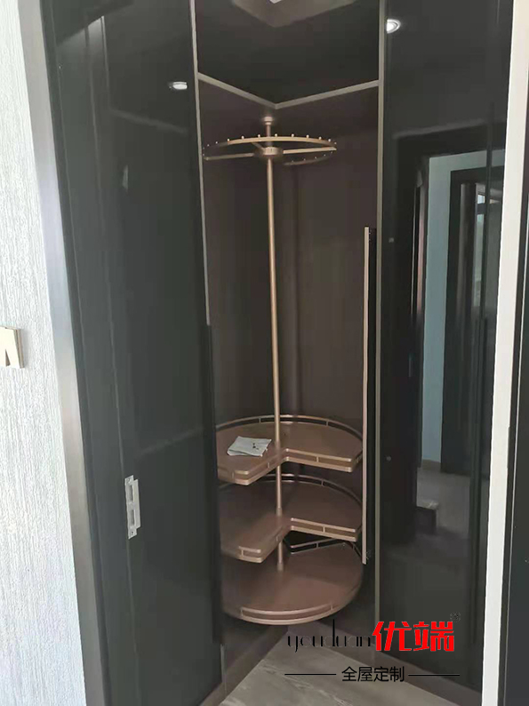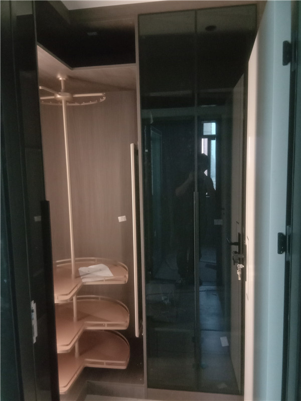 柜子都已安裝好啦,先來看看衣柜吧,轉角放了一個諾米旋轉掛衣桿,到時候疊放衣服也不會那么亂了,榻榻米擁有強大的收納空間,再也不愁東西多沒地方放了。灰玻玻璃門呈現出一種通透的感覺,整體顏值還是蠻高的!