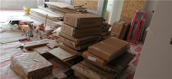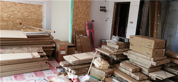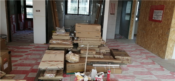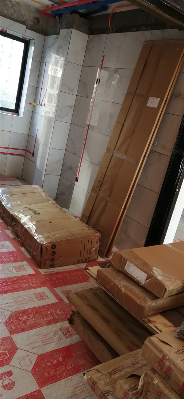 的廚房水槽、灶具、浴柜臺盆放置在現場,后期臺面安裝需用到。柜