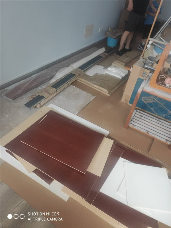 插槽背板離墻面1.7公分,防止使用時間常出現柜體發霉的現象。拆好的板師傅都整整齊齊放在墊板上,