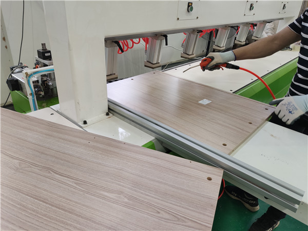 封邊的同時側面打孔也進行時。封邊采用的是1.0厚的pvc封邊條,方便前口倒圓弧,整體效果即美觀又不容易磕碰到。