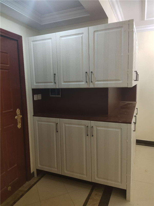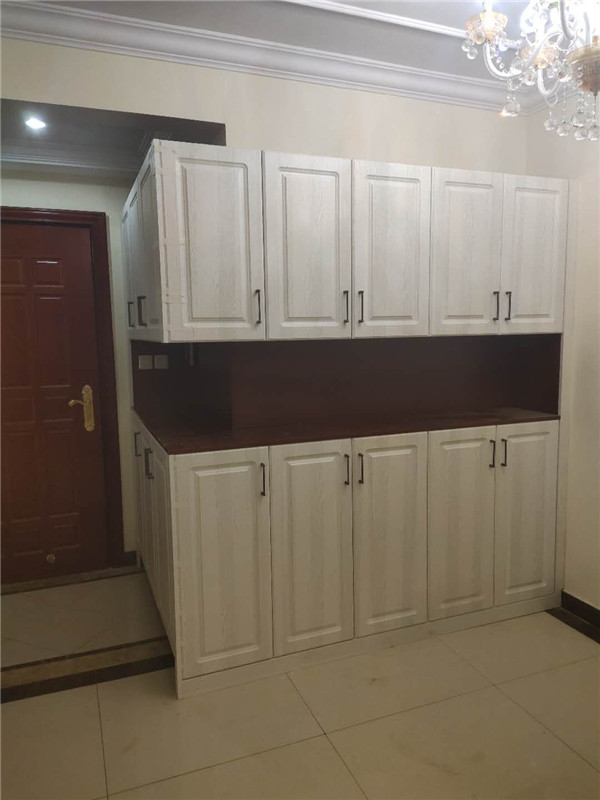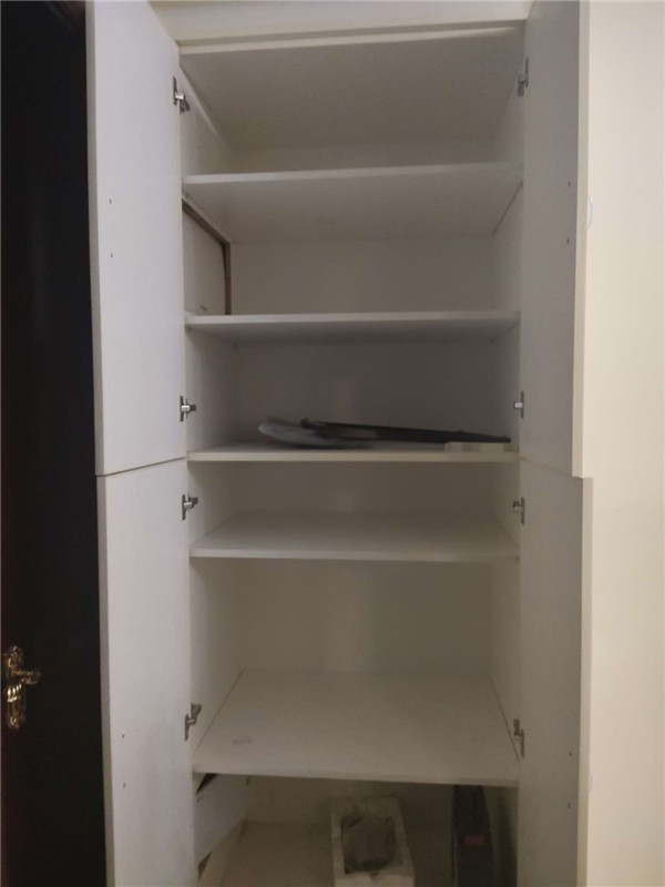 柜子安裝完畢了,因?yàn)榭蛻艏沂蔷b修,頂上有陰角線所以柜子沒(méi)有做到頂,最終效果還是可以的