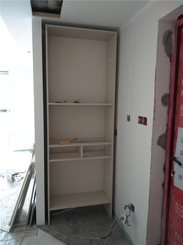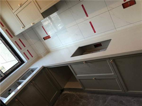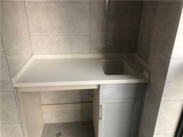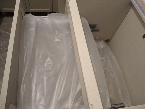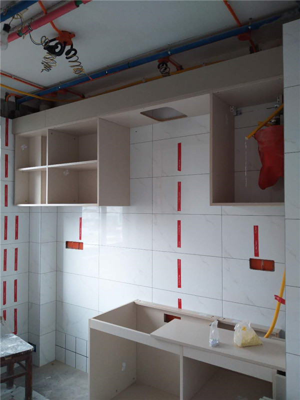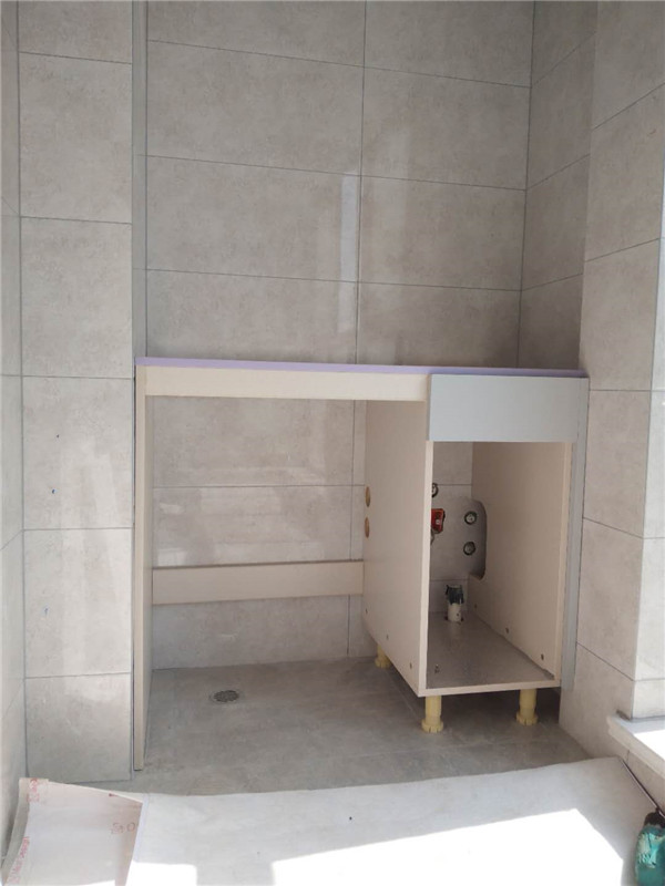 房水槽、灶具、浴柜臺盆放置在現(xiàn)場,后期臺面安裝需用到。柜子安裝好后進入臺面測量環(huán)節(jié),臺面