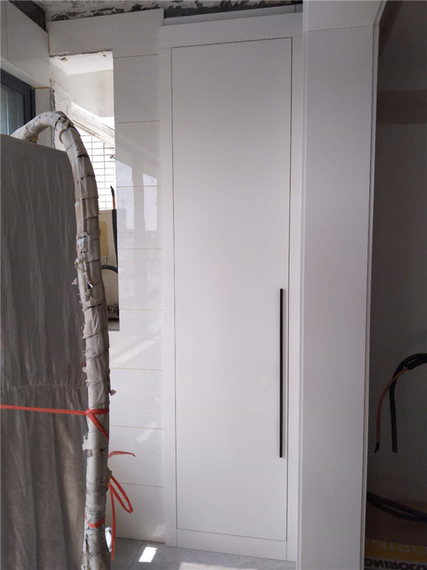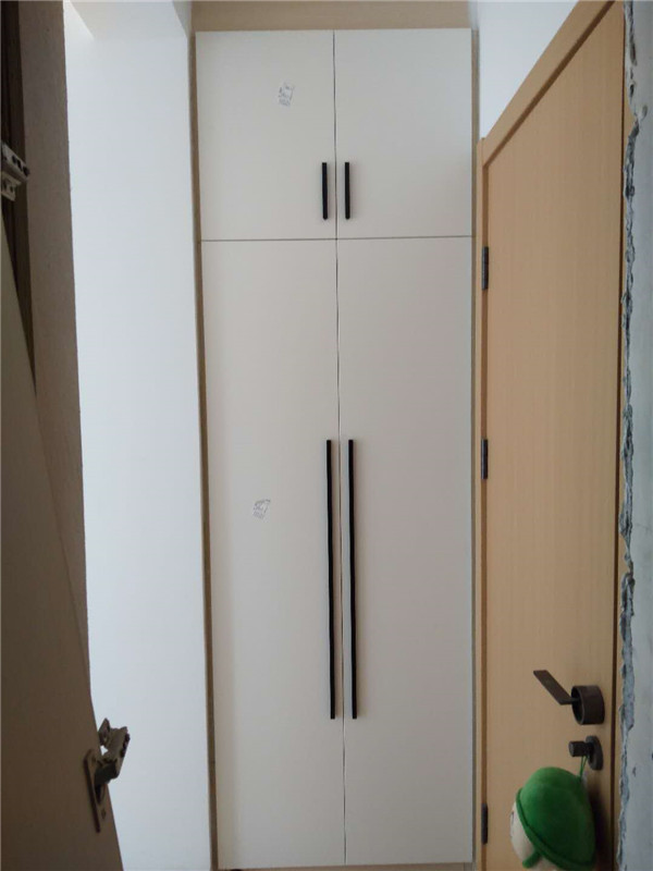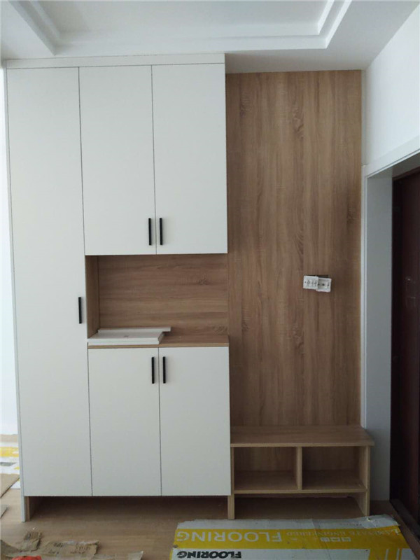 業主家柜門都用的白色平板門,搭配黑色拉手,鞋柜處做了一個穿鞋的凳子,