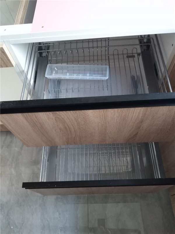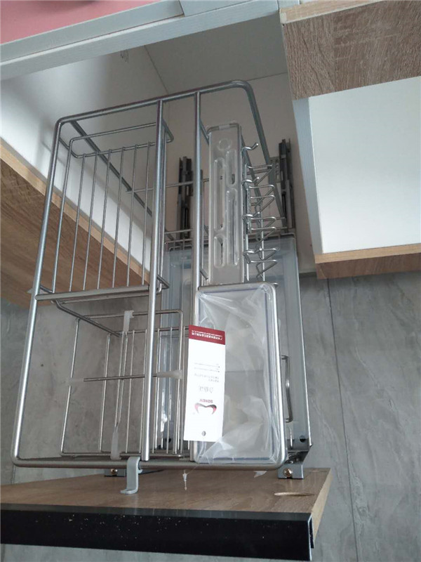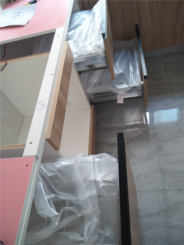 廚房拉籃碗籃調味料三件套我們標配的諾米銀爵系列的,我們都用塑料膜保護起來了,防止灰塵進入影響導軌的拉伸。