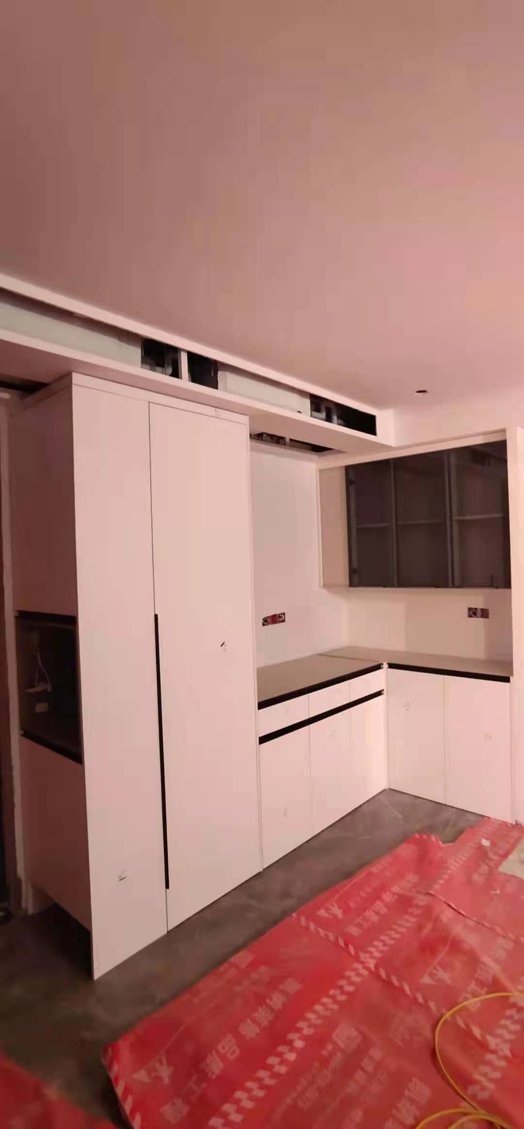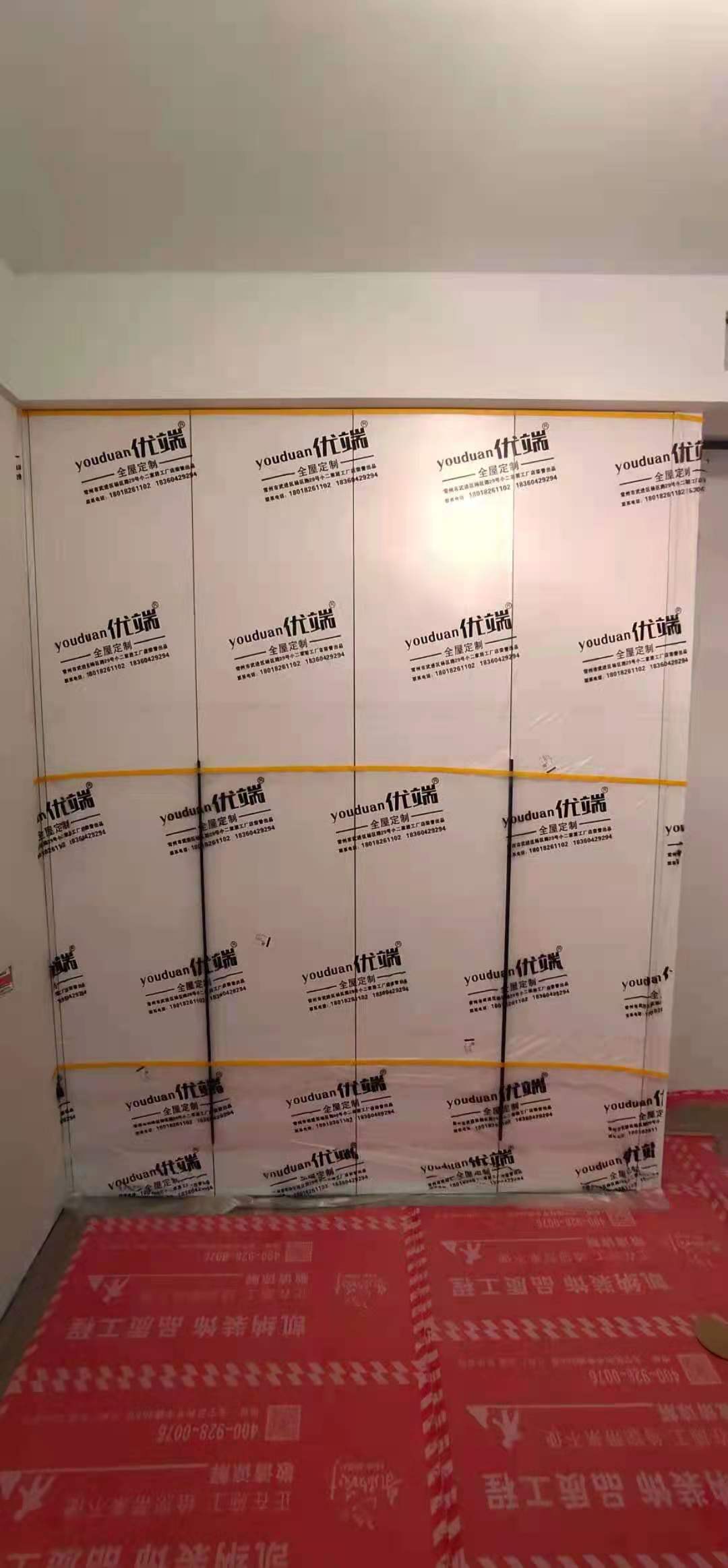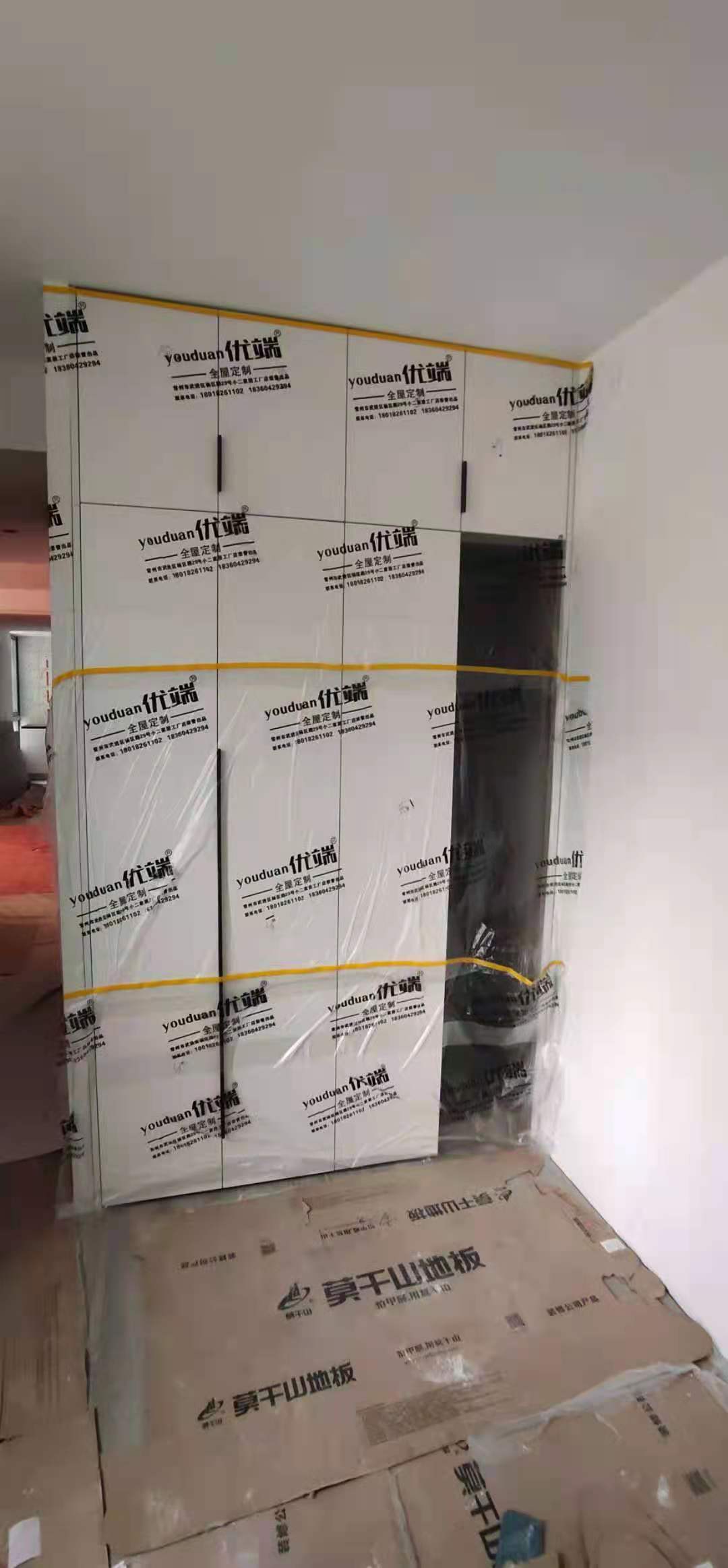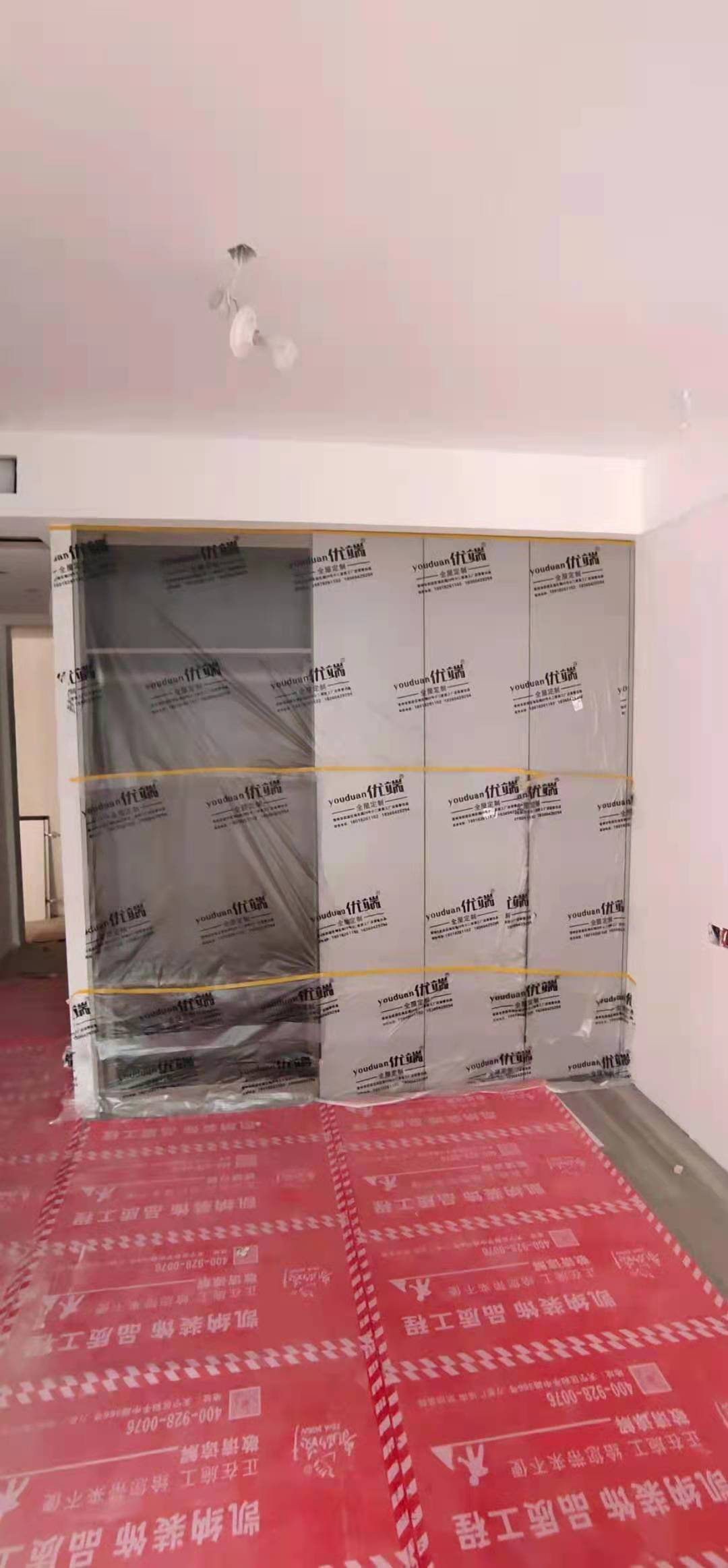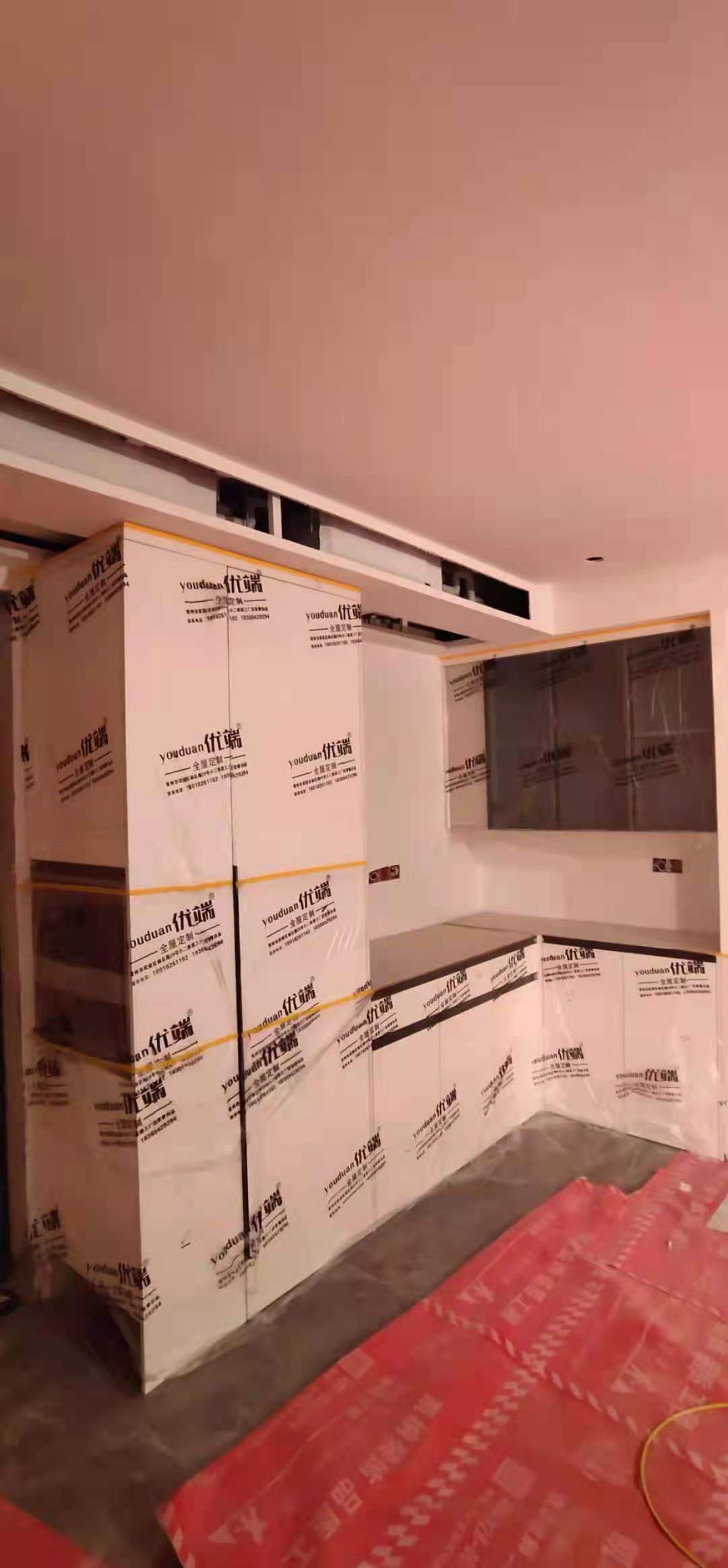 柜門柜體已經(jīng)安裝好,都用塑料膜保護(hù)起來了,防止灰塵進(jìn)入影響導(dǎo)軌的拉伸。
