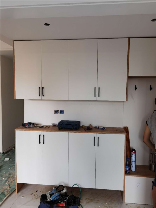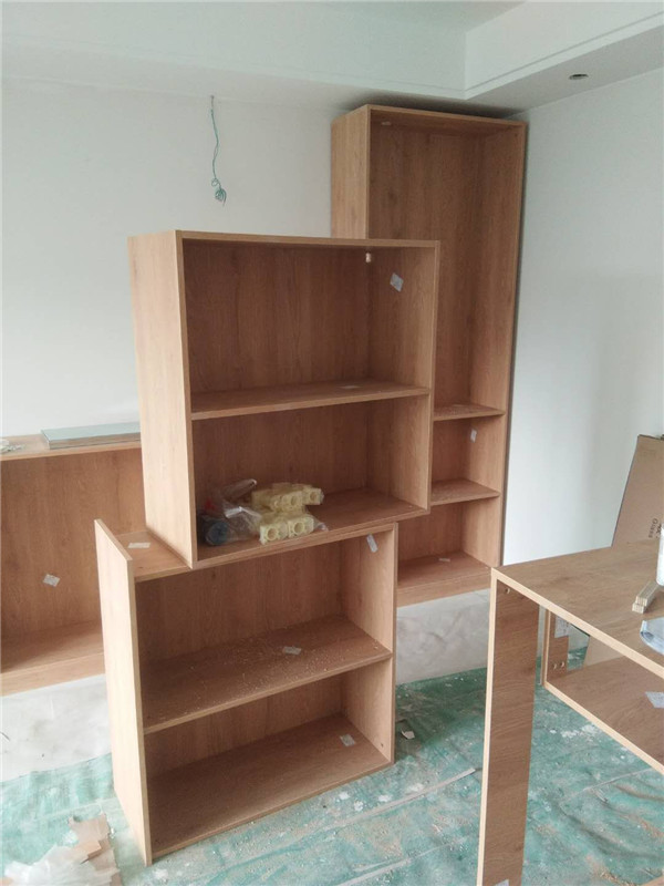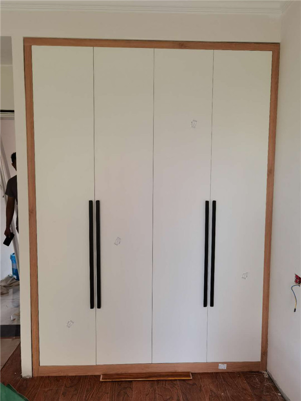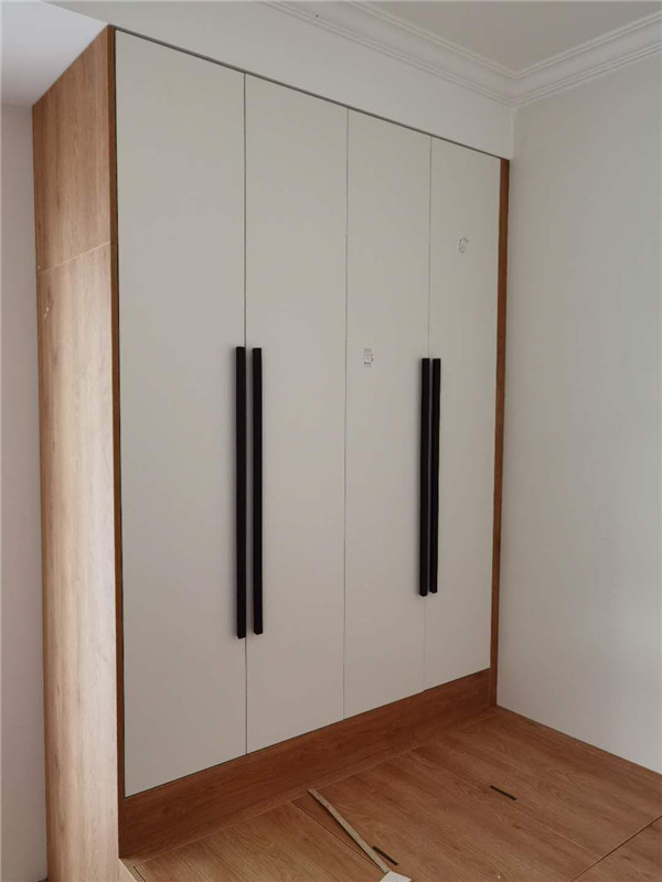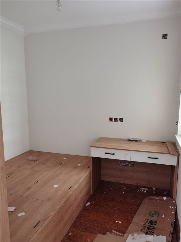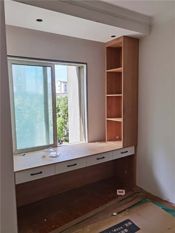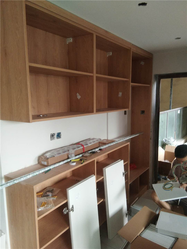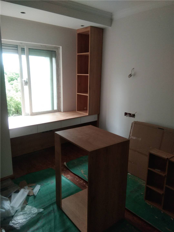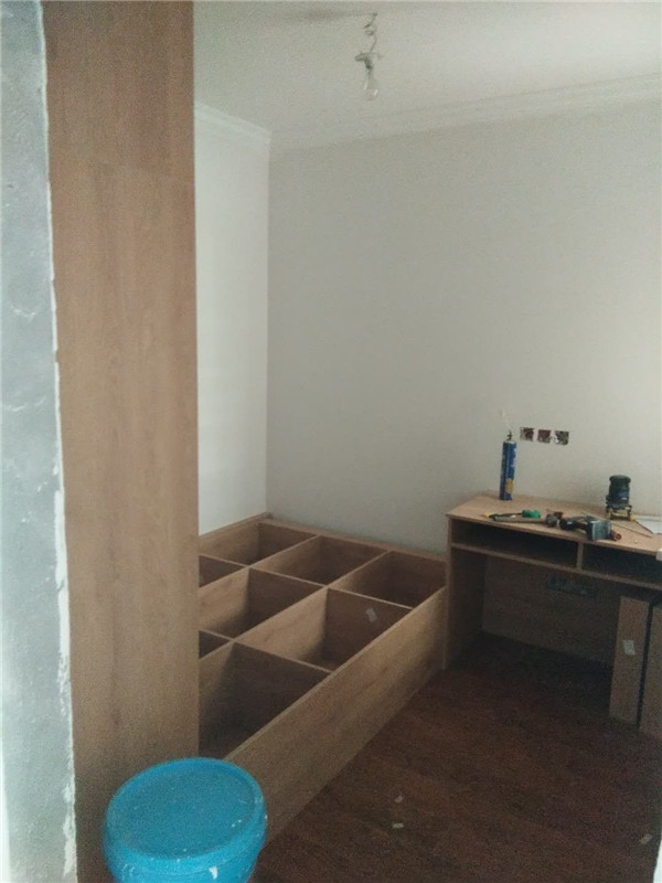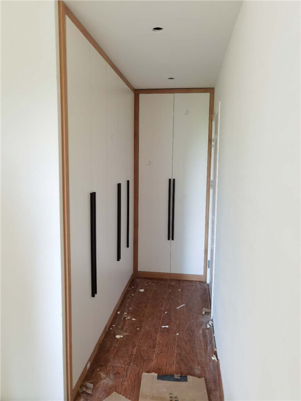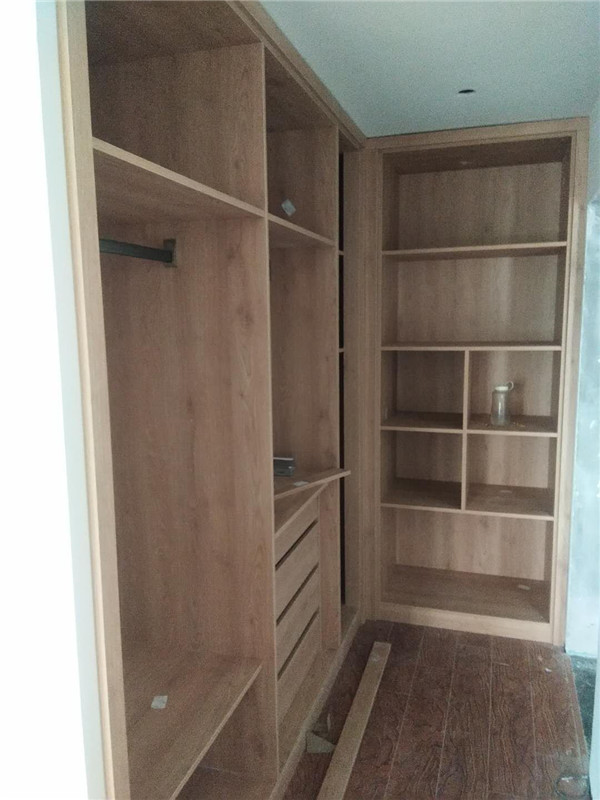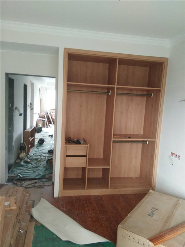 部分柜子已安裝完畢固定起來了,衣柜柜體采用的原木色,整體效果看上去暖暖的,