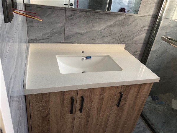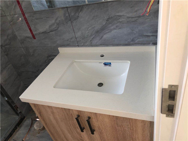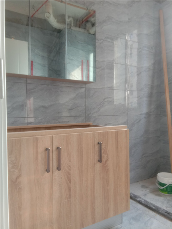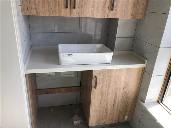 浴柜臺盆放置在現(xiàn)場,后期臺面安裝需用到。柜子安裝好后進(jìn)入臺面測量環(huán)節(jié),
