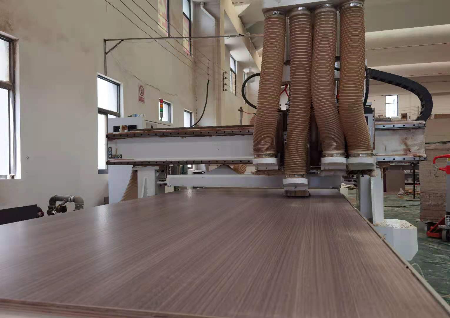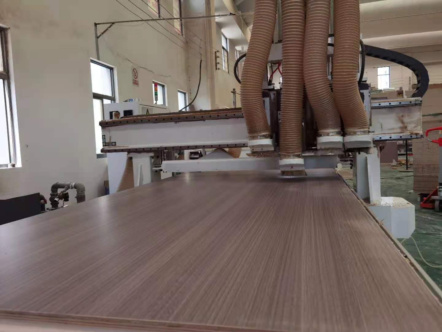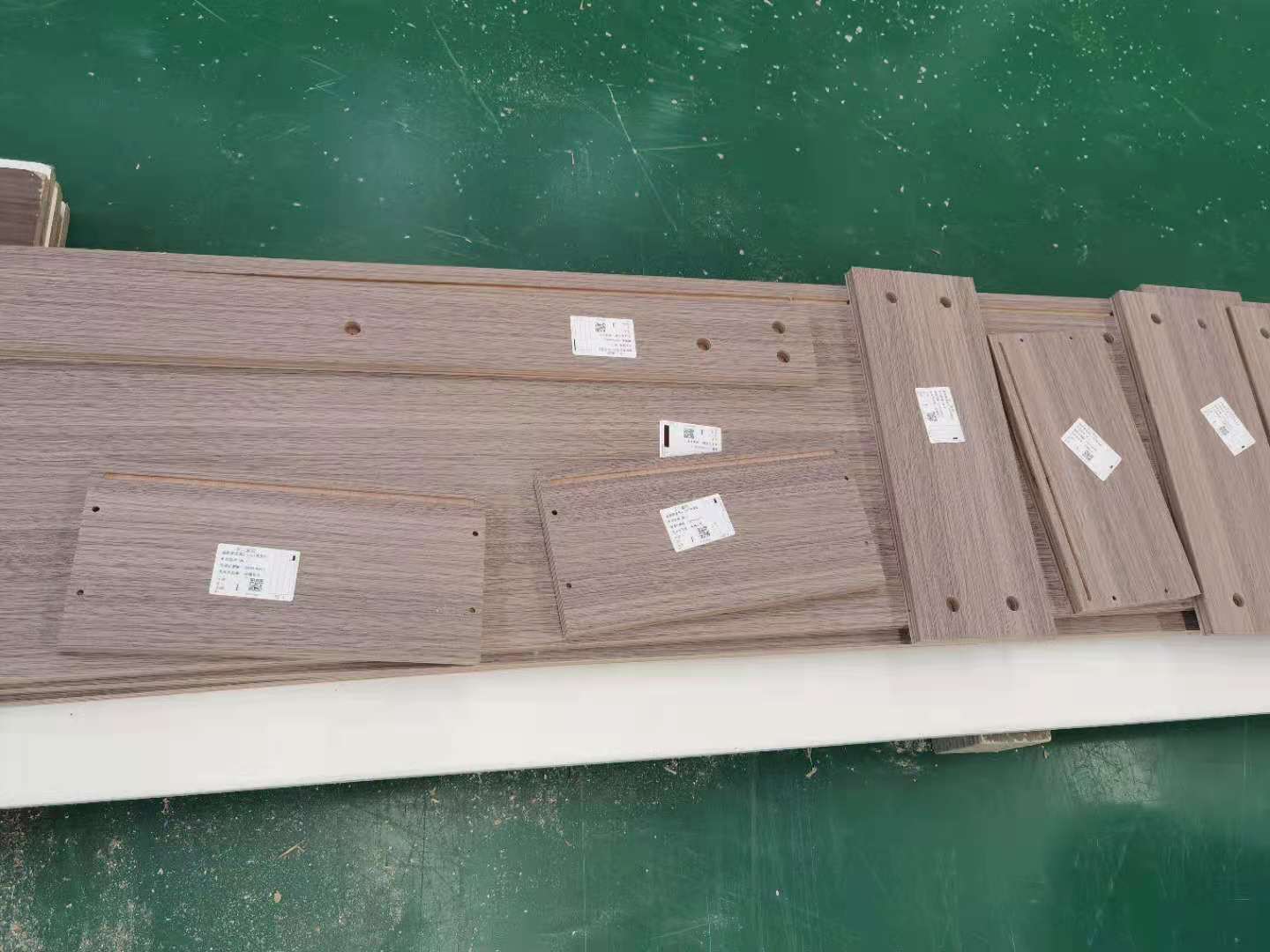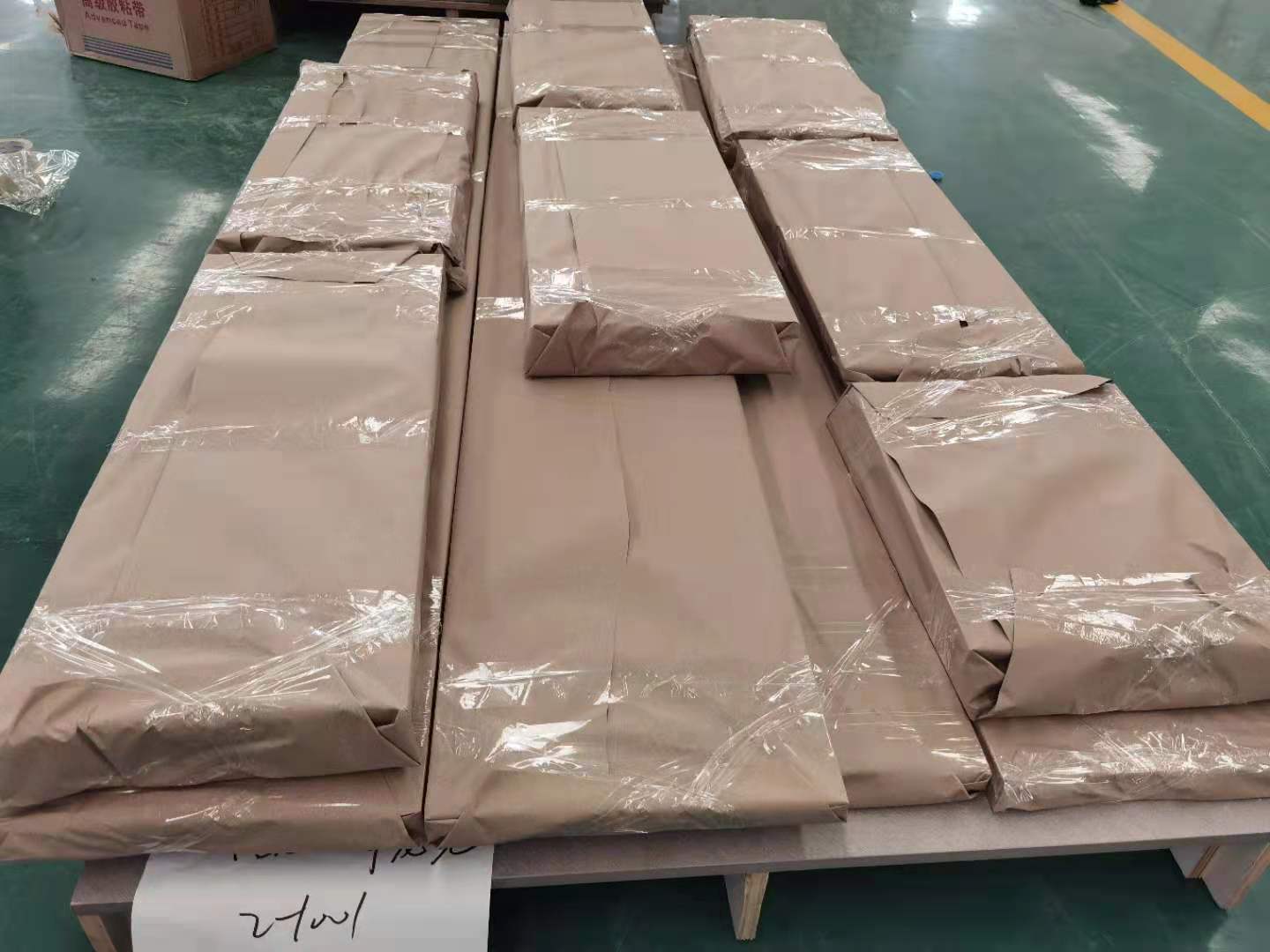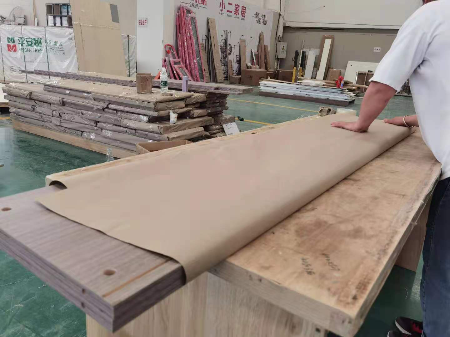 開始制作啦,專業設備裁板,板材使用平安樹實木多層E0級制作,有高級的藍光防偽標識哦,邊口都是直的,沒有爆邊的情況,這樣后面封出來的板更圓滑,全自動機器開料尺寸更精準,拆好的板材師傅都整整齊齊的放在墊板上,板下面都墊了墊板的哦,第一防止地面有東西劃傷,第二防潮。