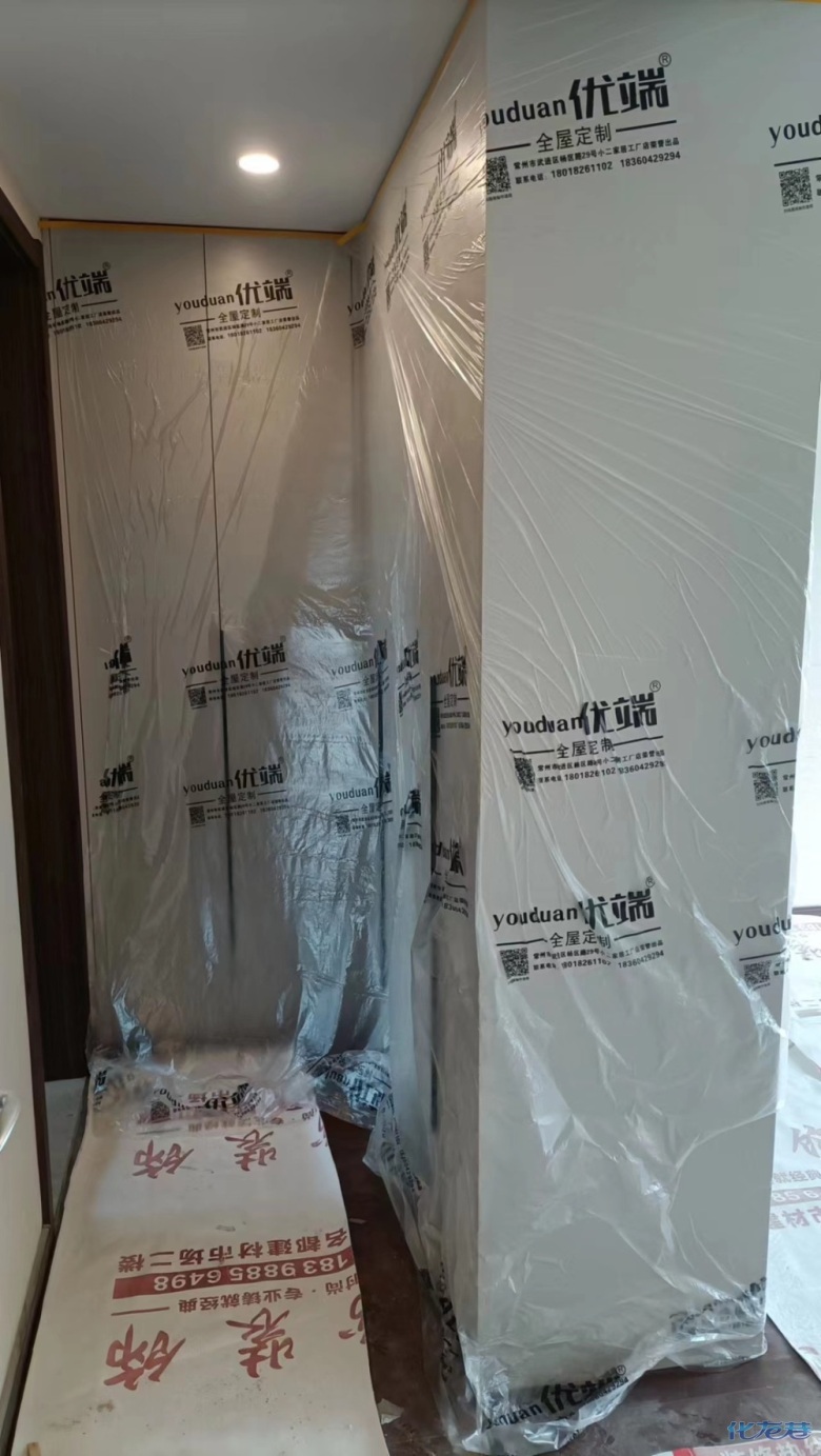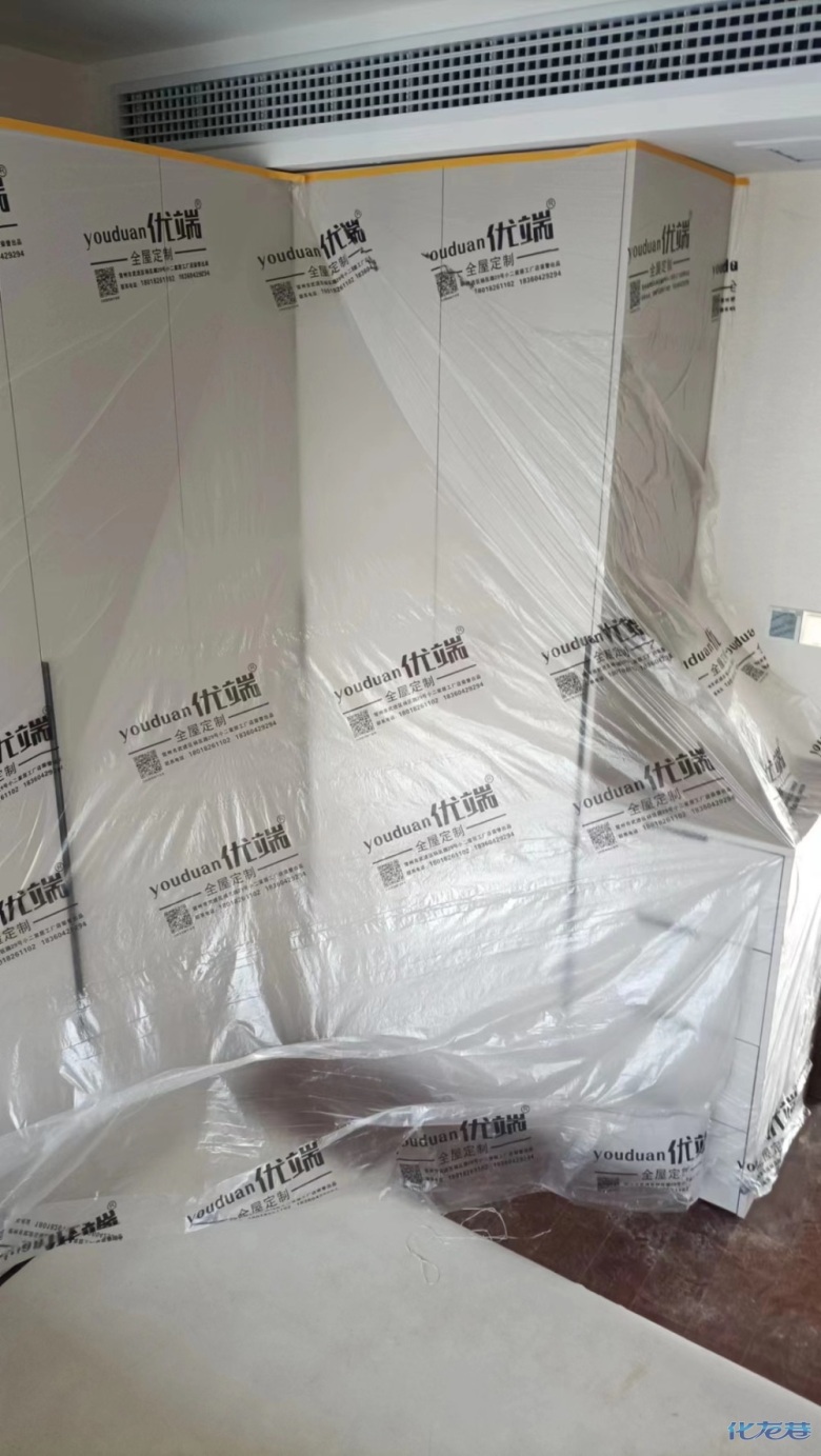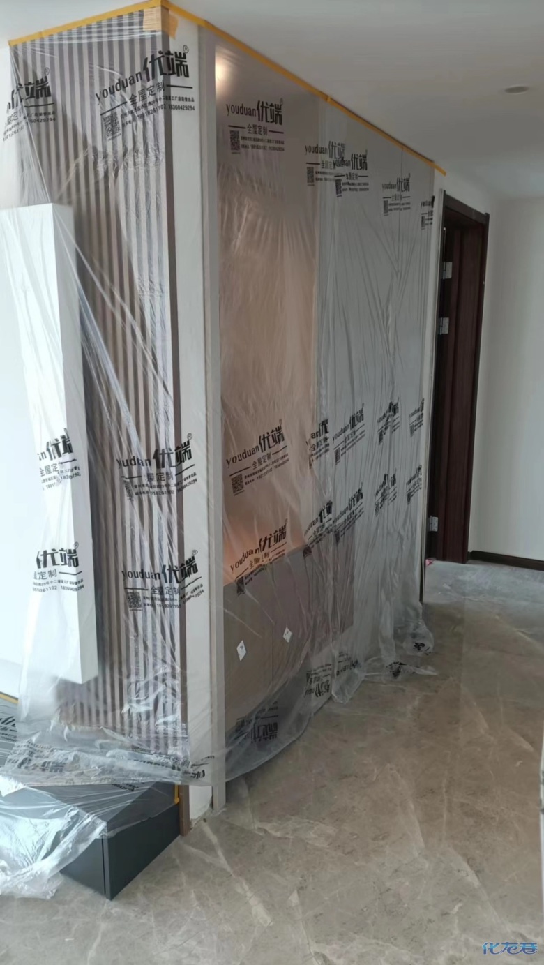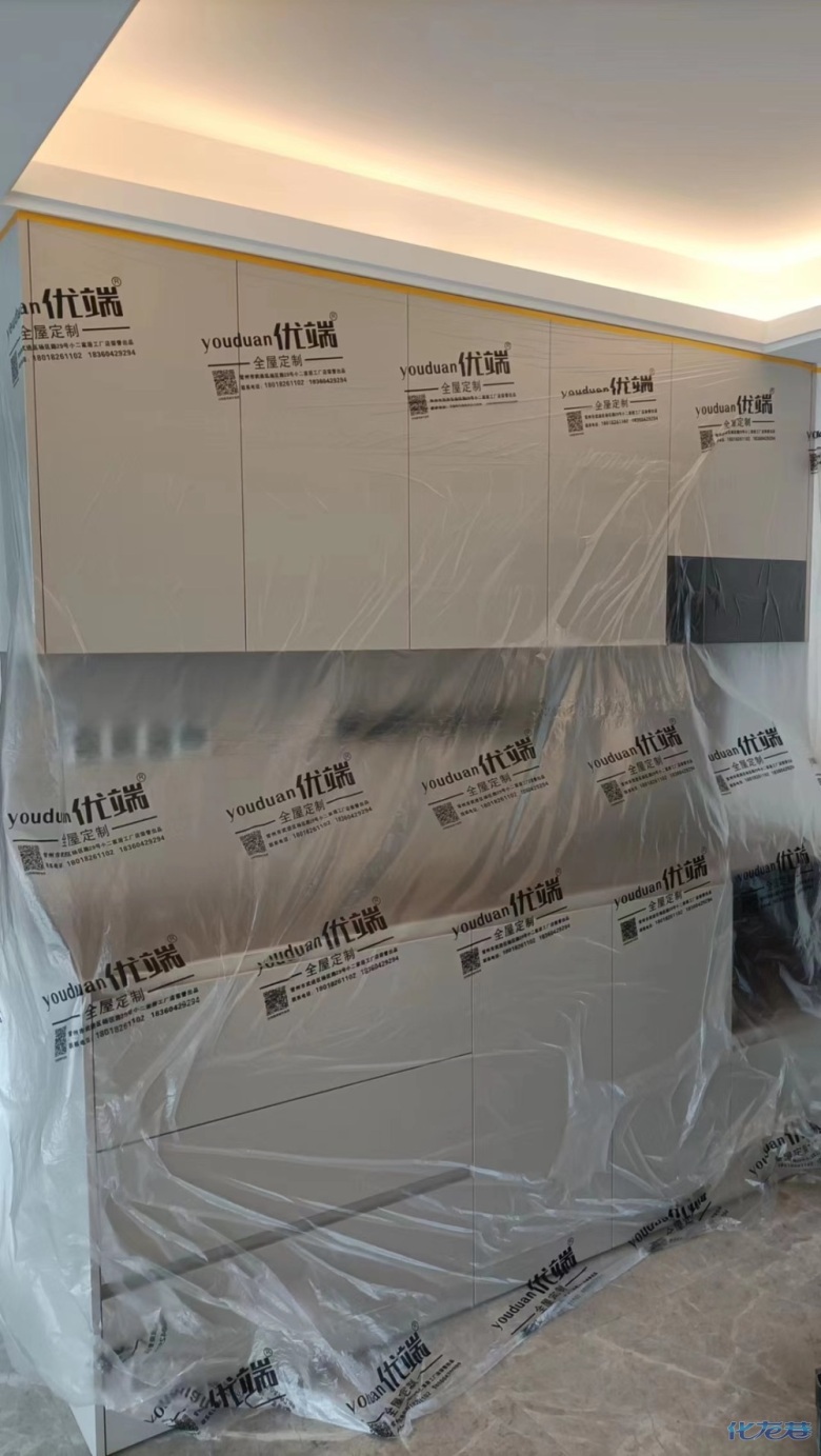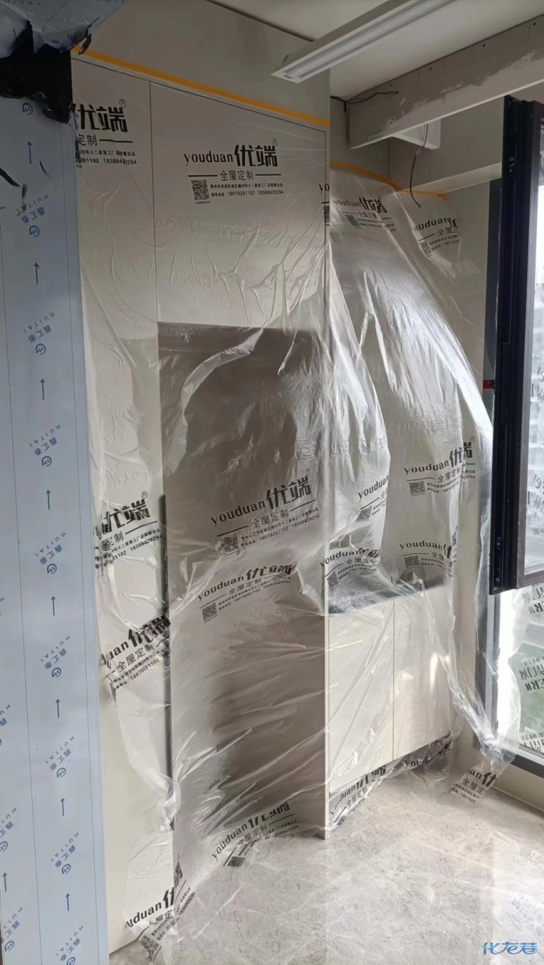 安裝完成的柜子都用塑料膜保護(hù)起來了