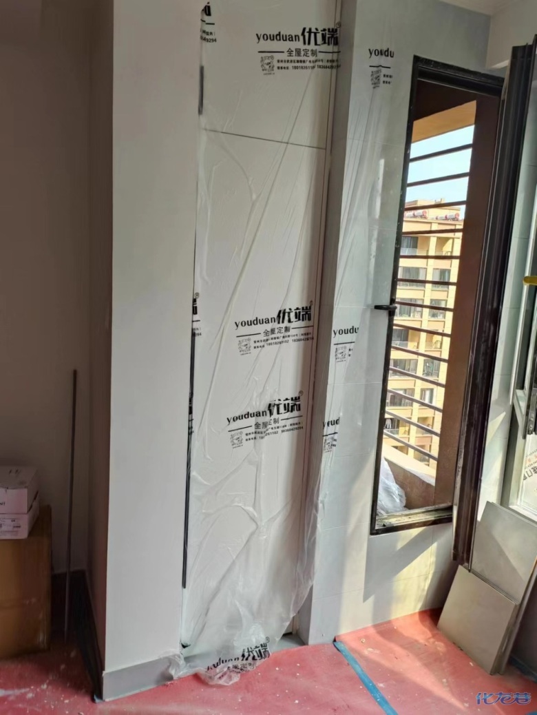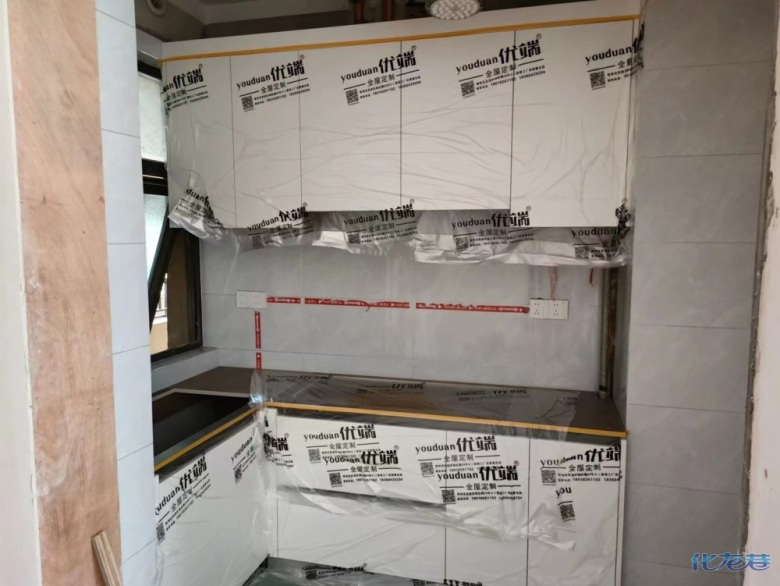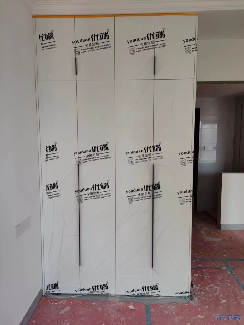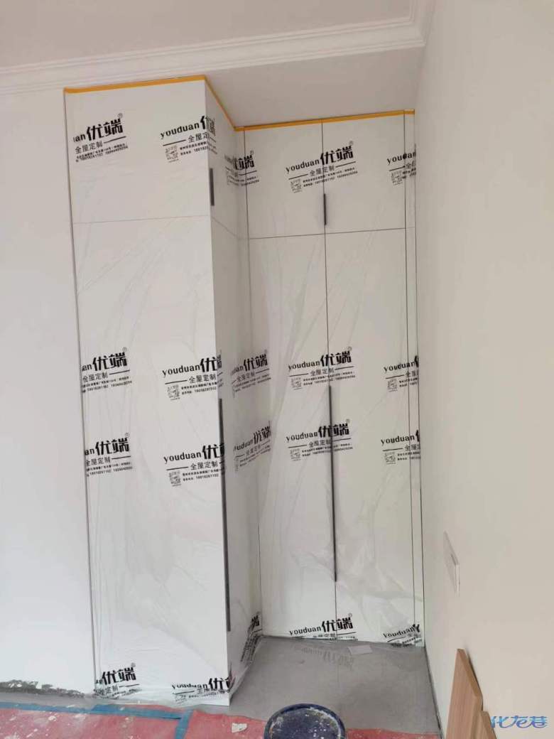 柜子安裝完畢,安裝完成的柜子都用塑料膜保護起來了,防止灰塵進入影響導軌的拉伸,安裝后效果很好,顏值也高!