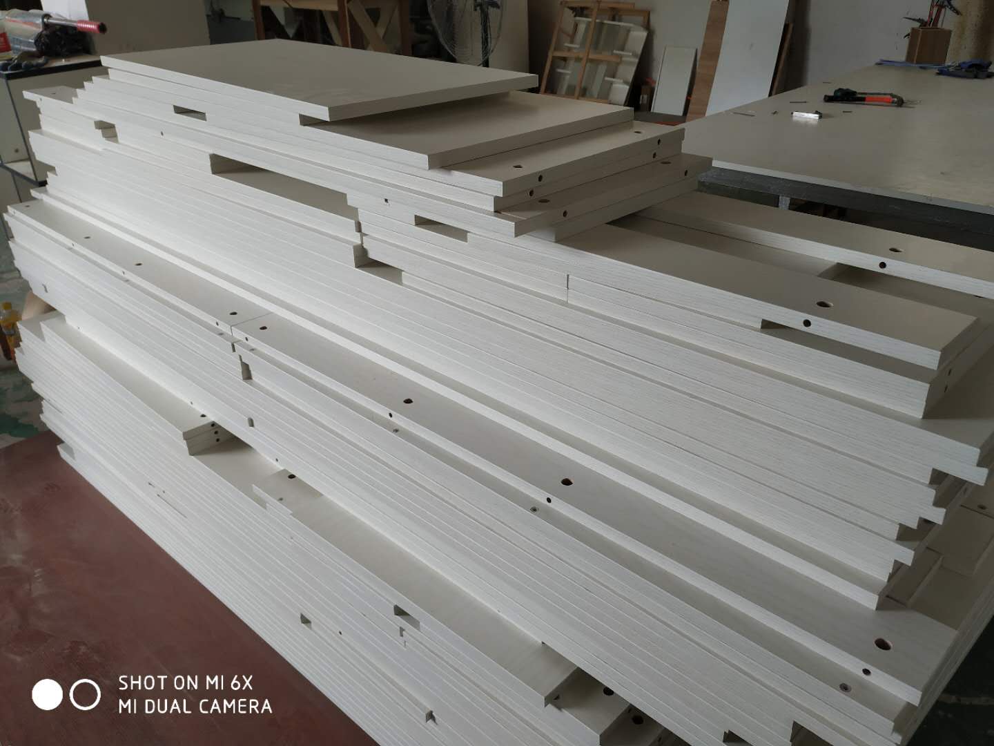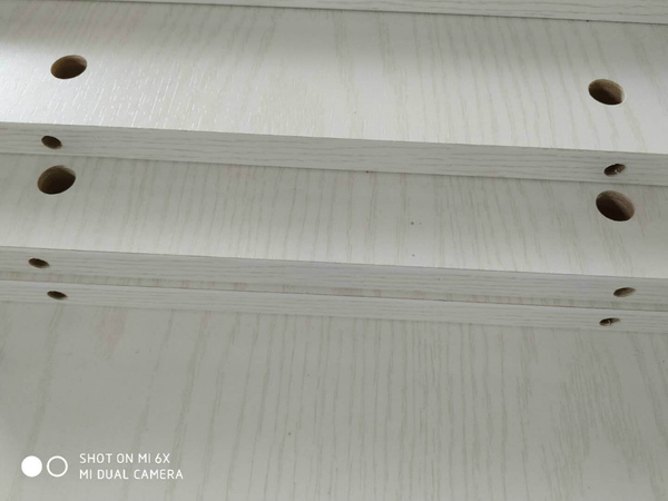 陽臺吊柜板打孔中,板材使用平安樹實木多層板,有高級藍光防偽標志哦!
