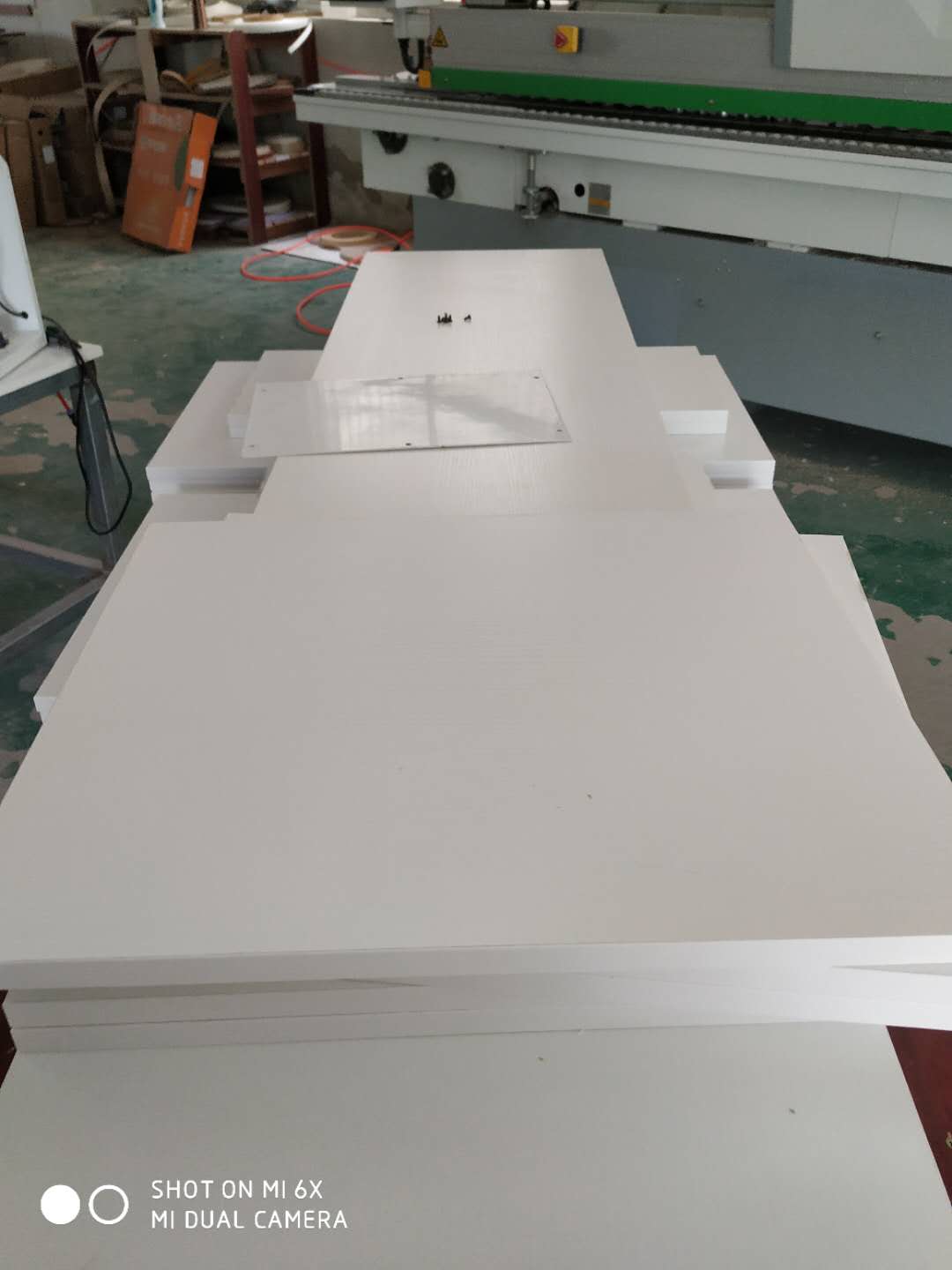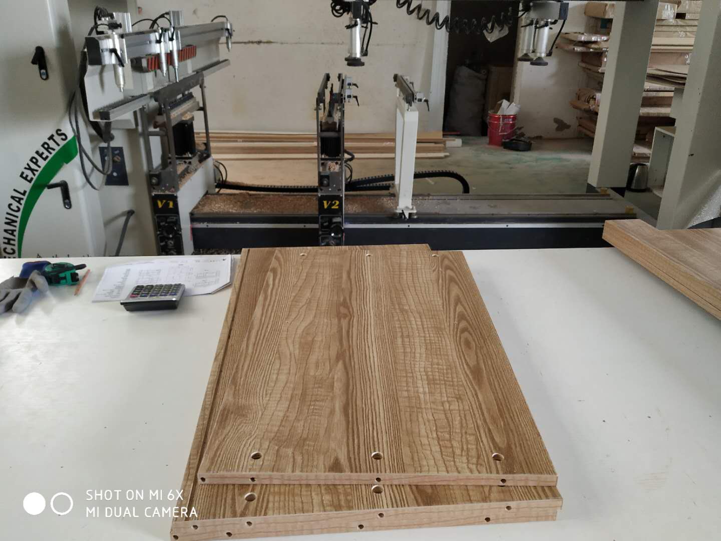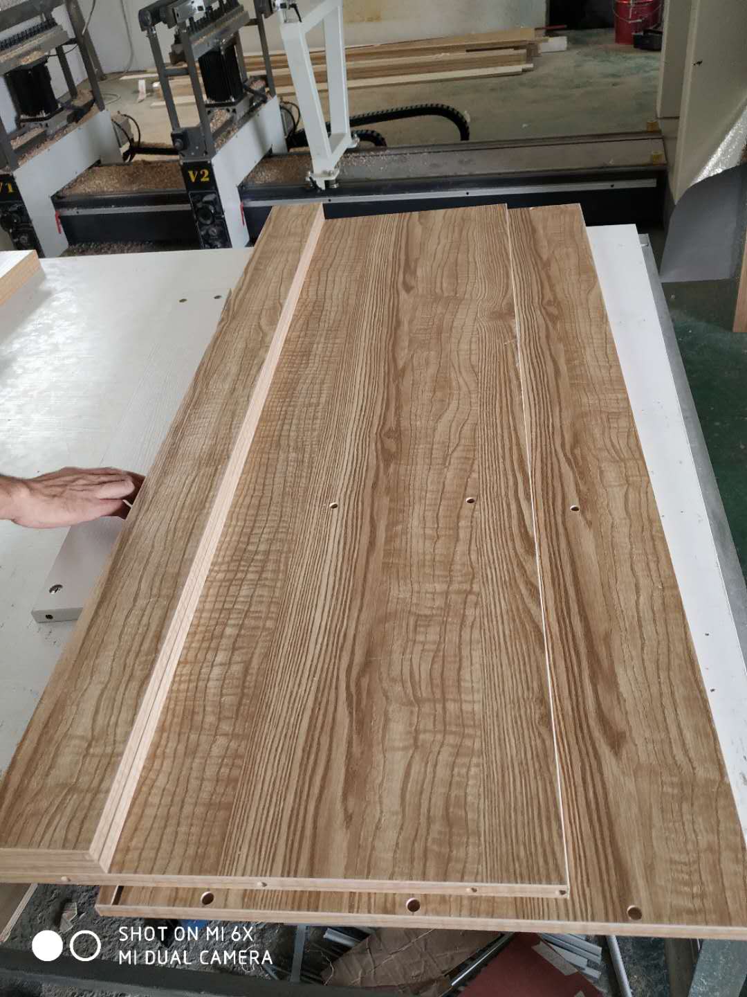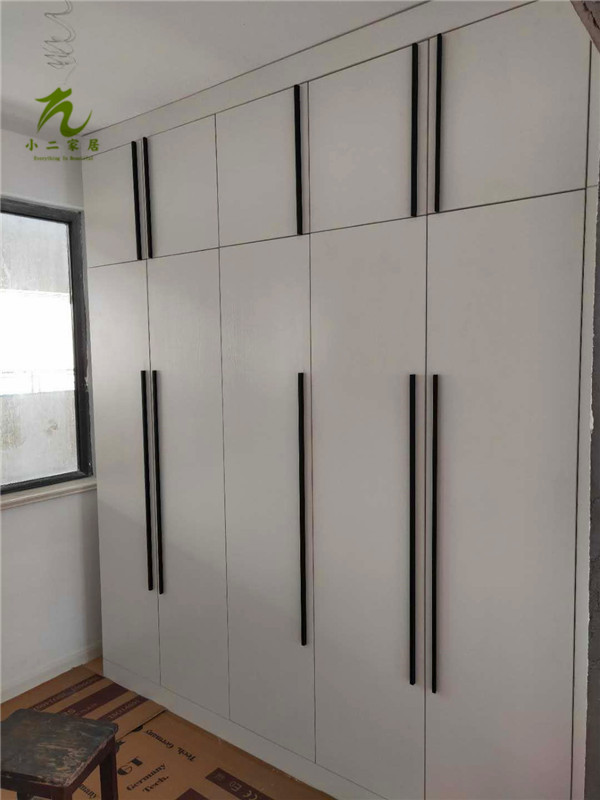門板封邊準備打孔,封邊條上印有小二家居的logo!主臥衣柜等打孔中。