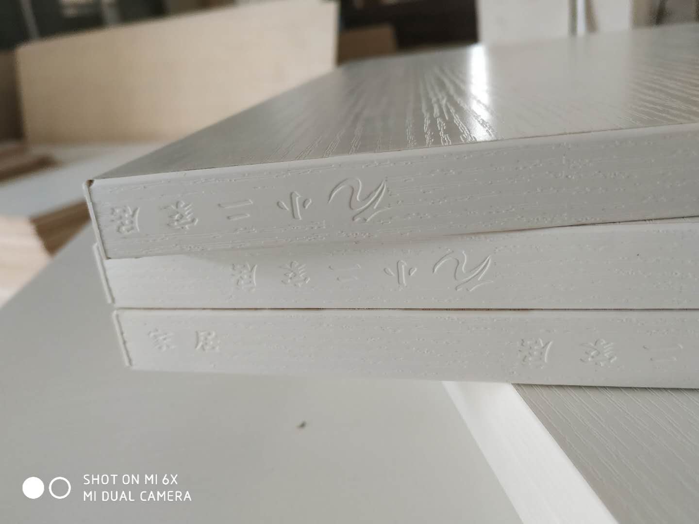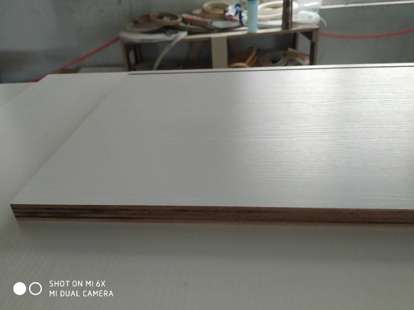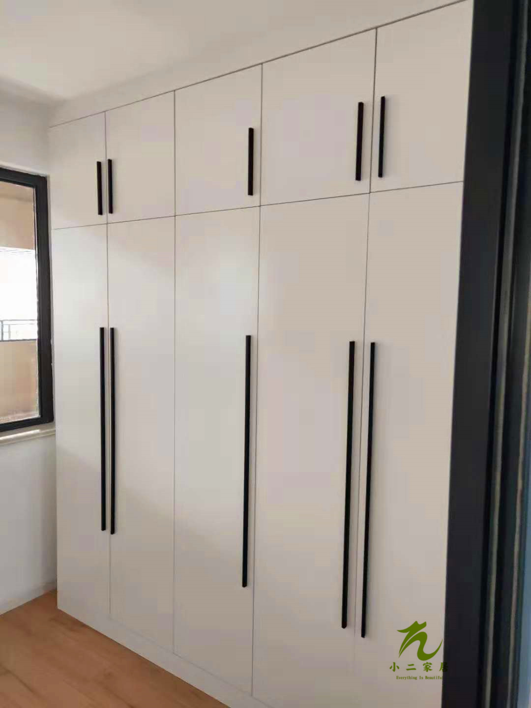 門板封邊準備打孔,封邊條上印有小二家居的logo!主臥衣柜等打孔中。