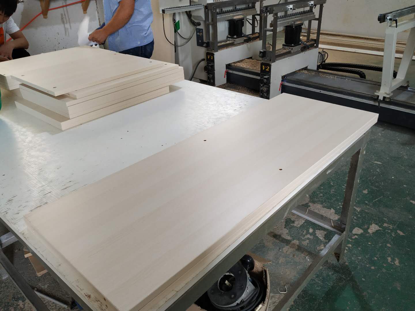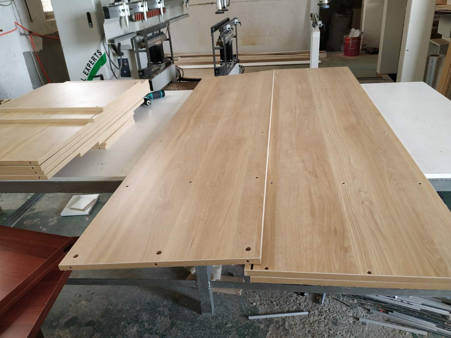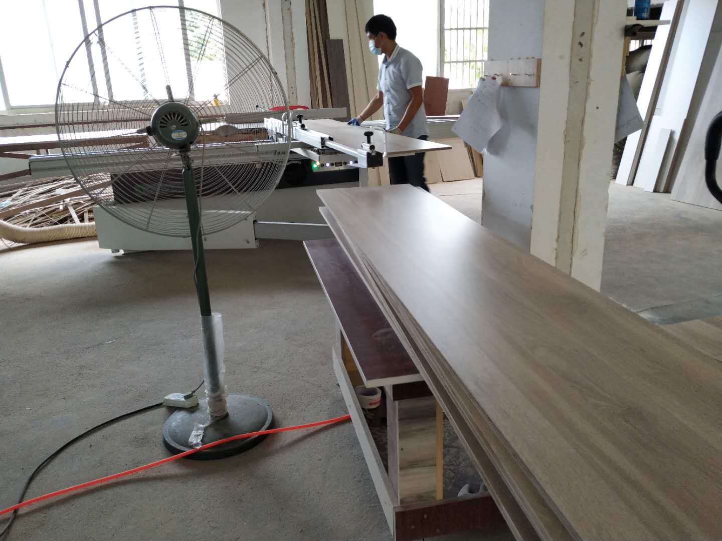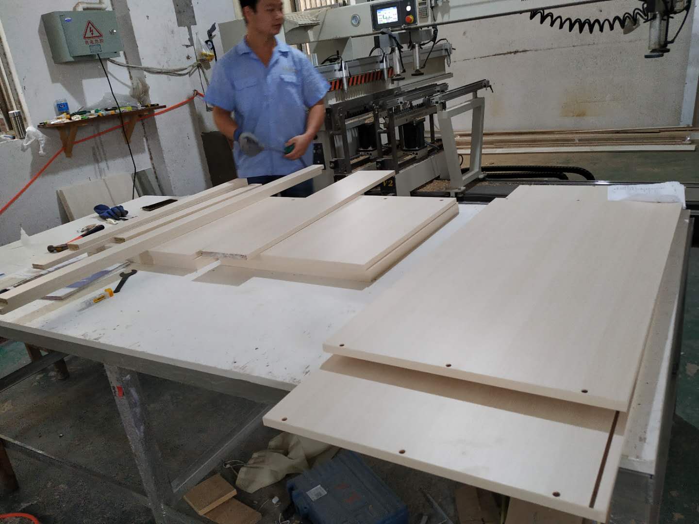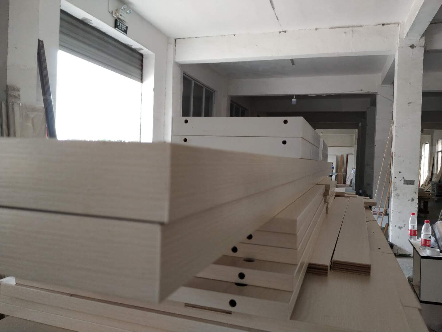 櫥柜高柜打孔中,衣柜裁板中,使用平安樹富貴灰橡板制作衣柜,金沙榆板制作櫥柜!期待它們能在業主大大家大放光彩!
