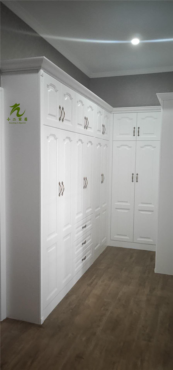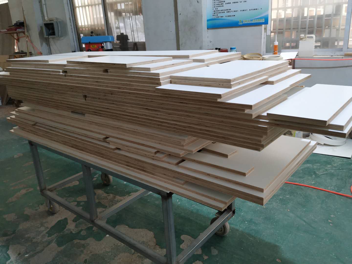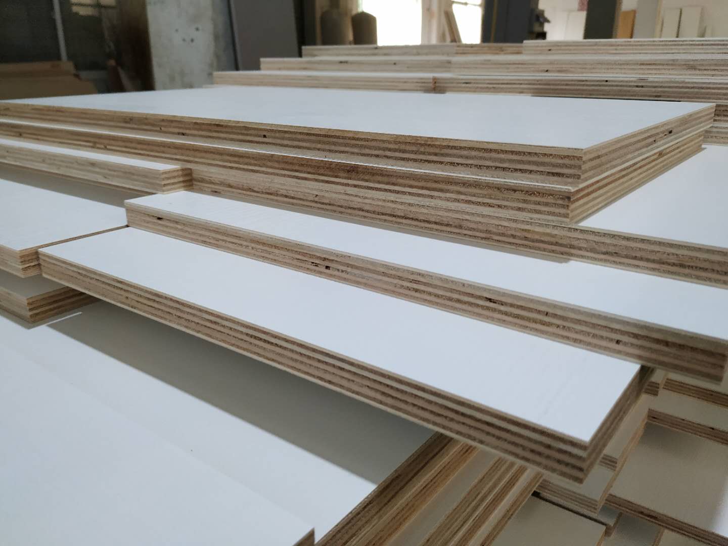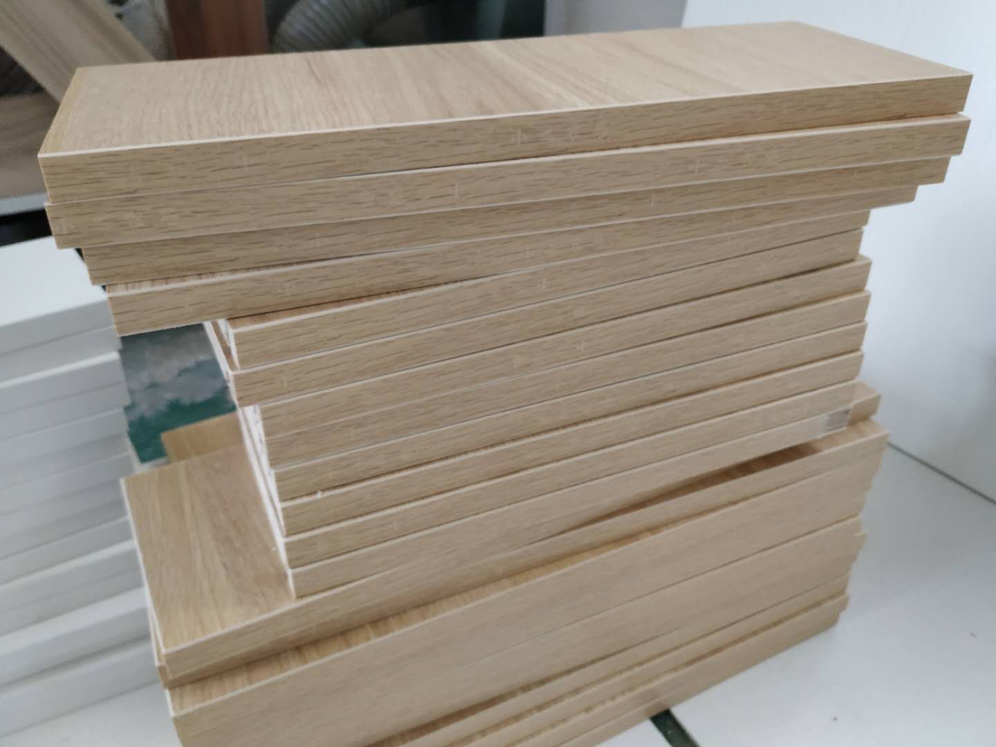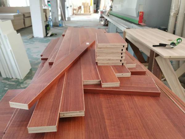 圖4圖5是待封邊的衣帽間和酒柜的板材,板材使用平安樹暖白色實木多層板制作。