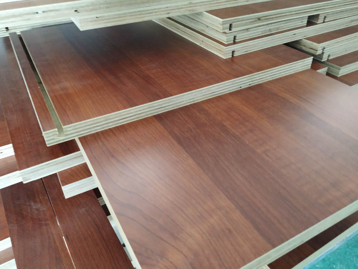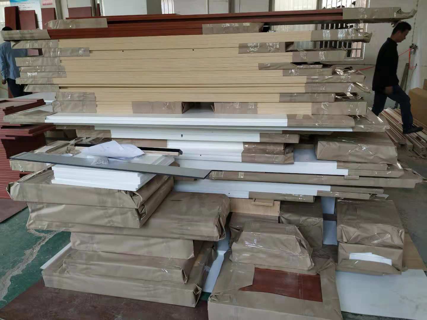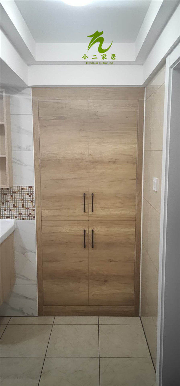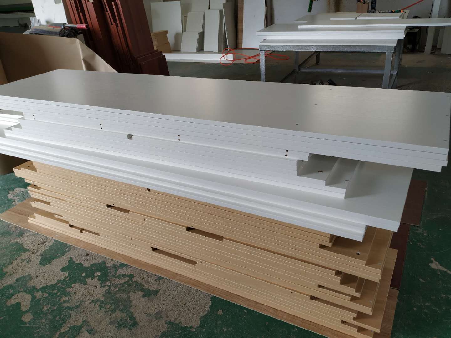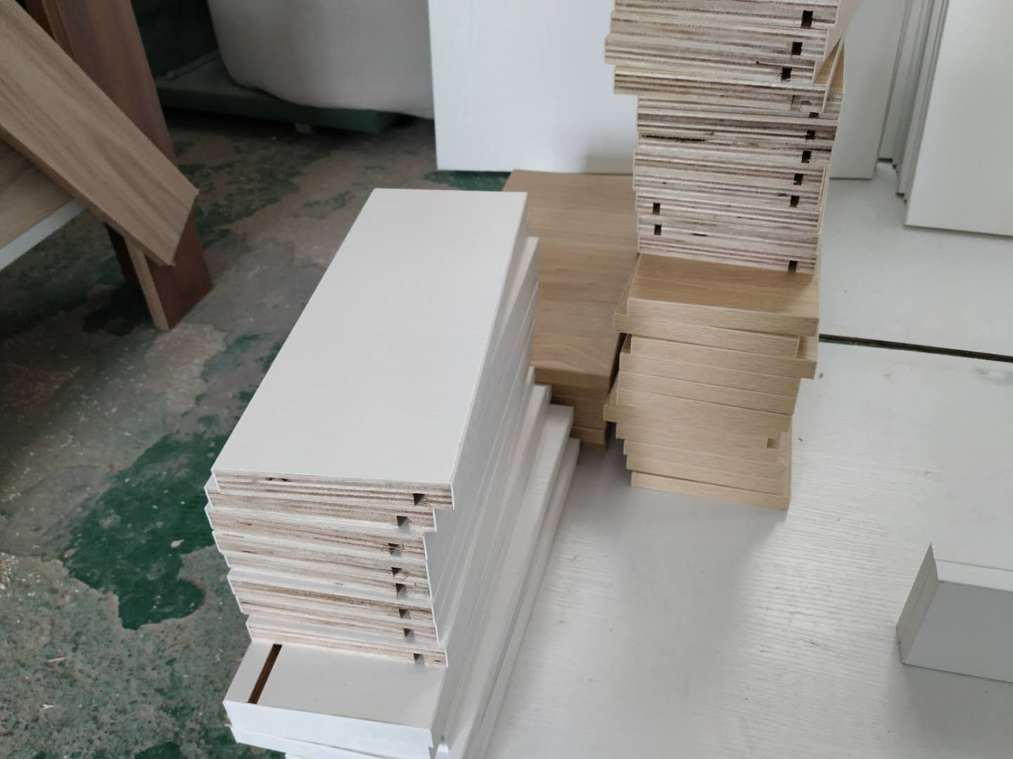 圖4圖5是待封邊的衣帽間和酒柜的板材,板材使用平安樹暖白色實木多層板制作。
