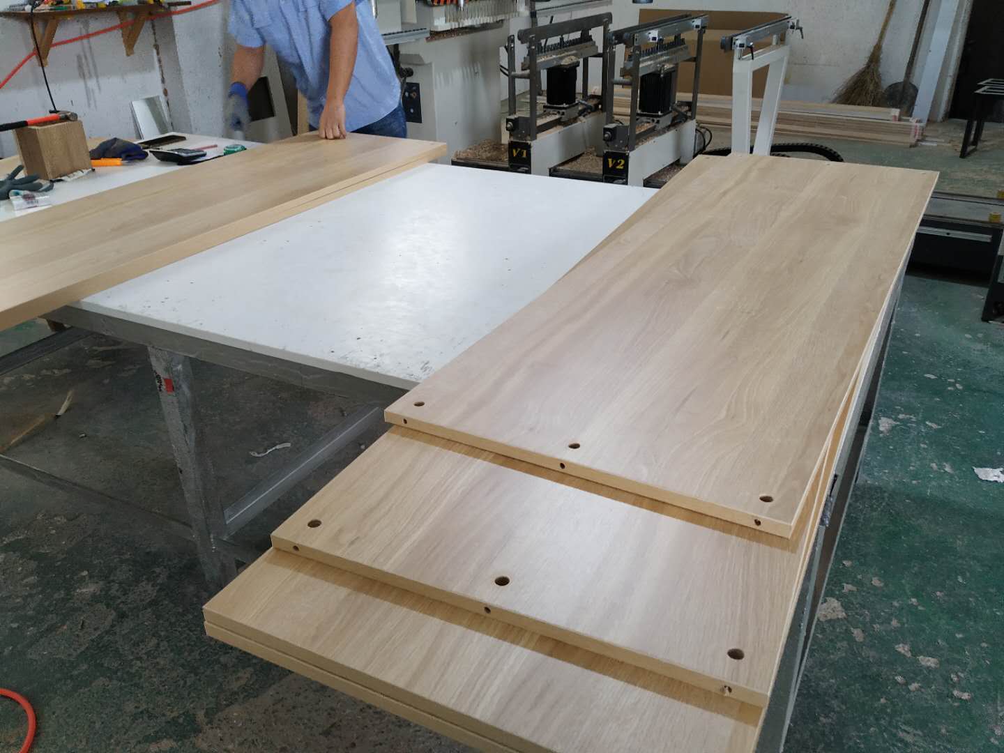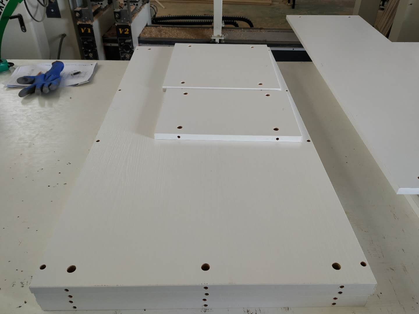 圖2圖3是正在打孔的衣帽間柜體板。