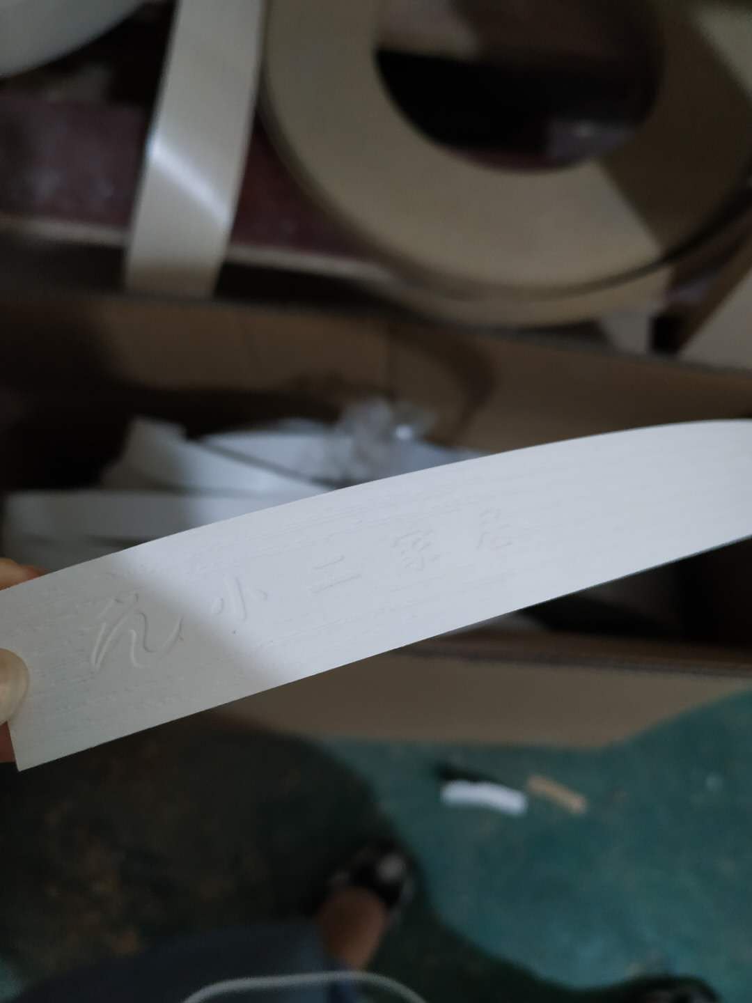 圖6是封邊用的顆粒熱熔膠。圖7是封邊用的封邊條,封邊條上有印有小二家居的logo!