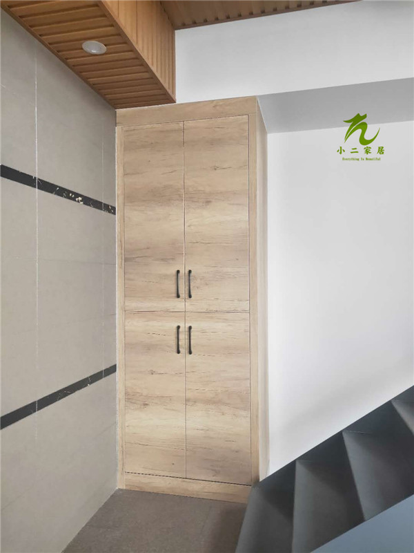 二樓衣柜板材制作打孔中,柜體板用平安樹清水橡木色實木多層板材制作。