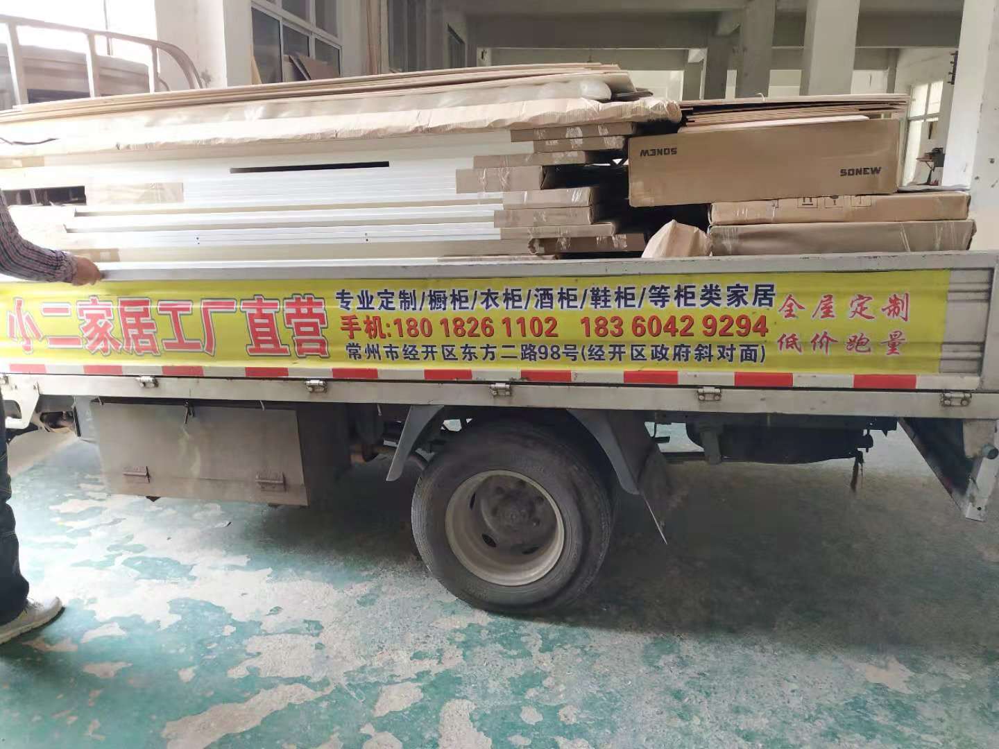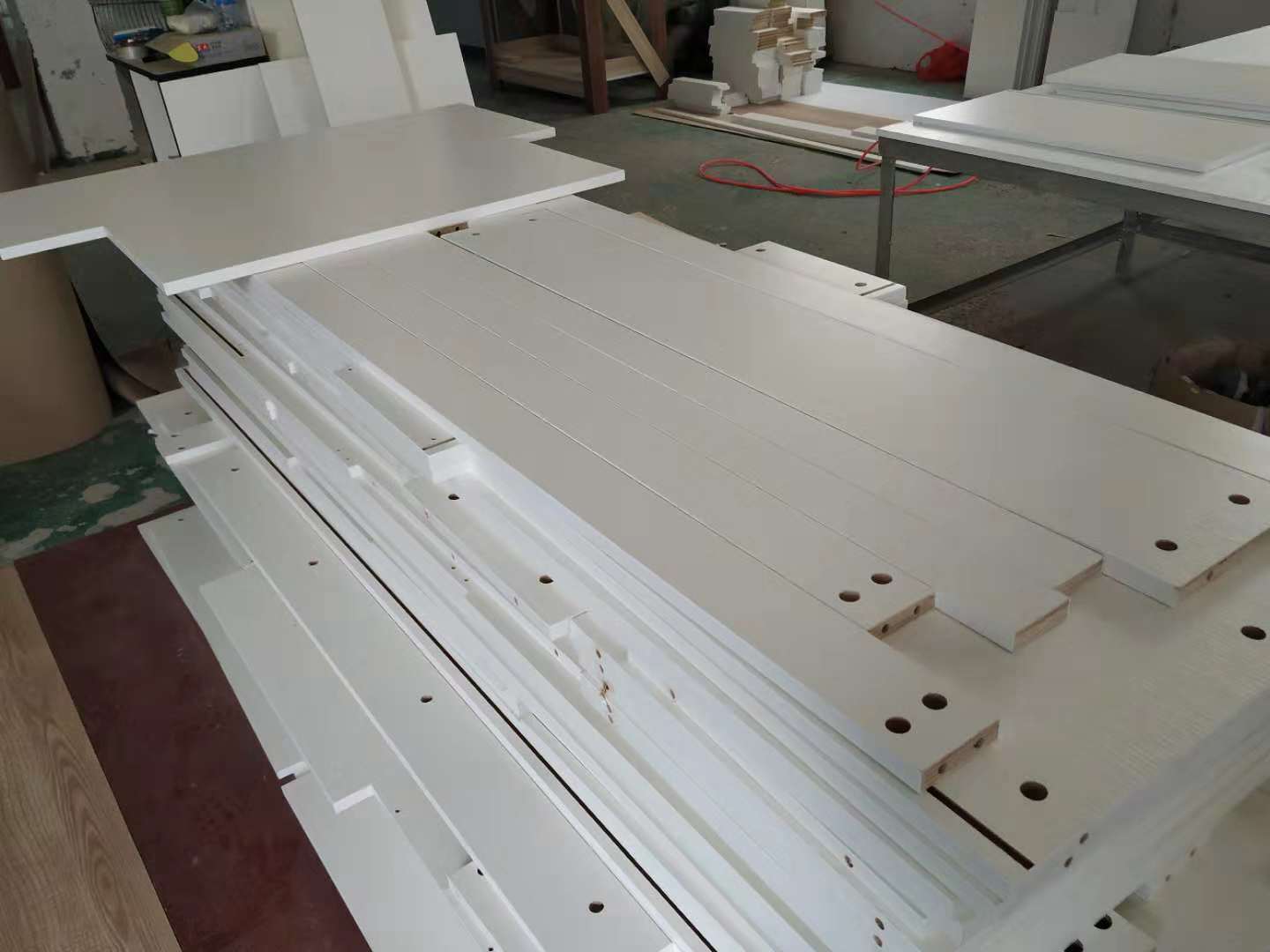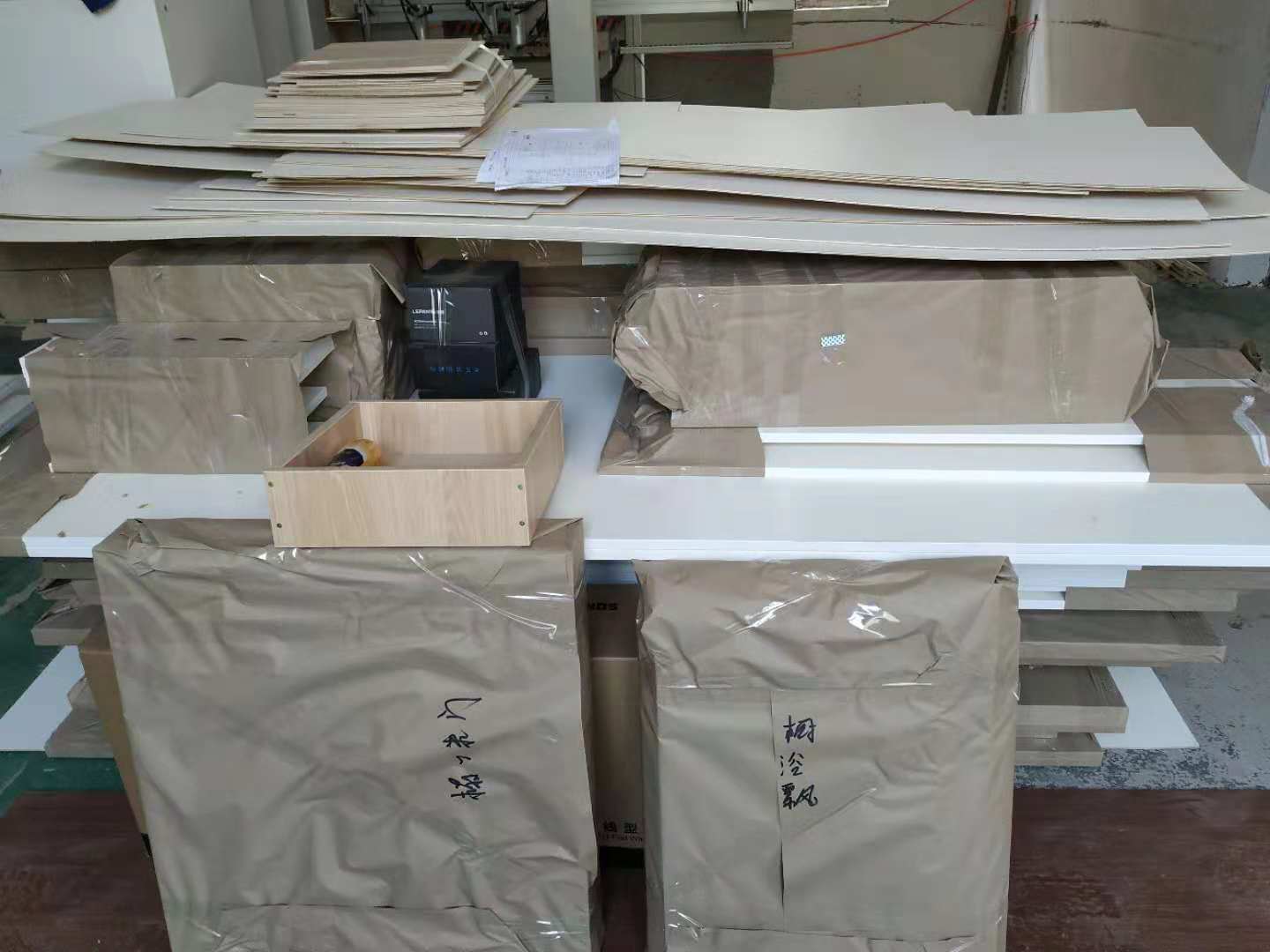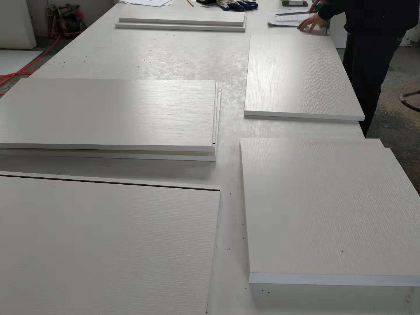 開始制作啦,榻榻米和衣柜板材已經打孔完畢,廚房櫥柜板制作中,板材已封邊,待打孔。