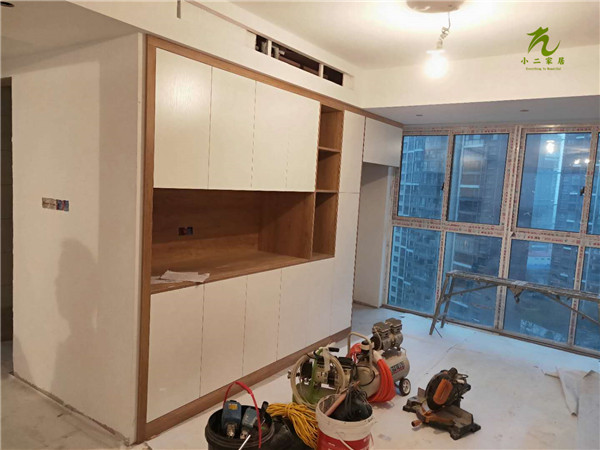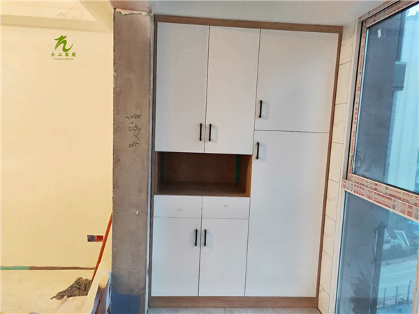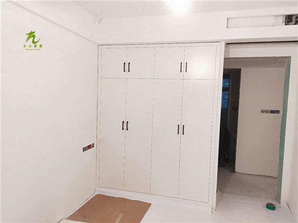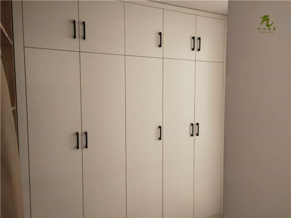 衣柜,衣帽間,餐邊柜和陽臺吊柜的柜體板材已經封好邊,打好孔啦,封邊條上印有小二家居的logo。