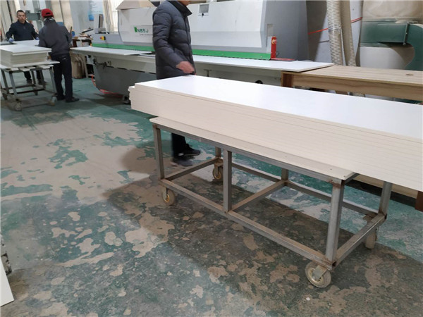 開始生產啦,衣柜和衣帽間板材裁板封邊中,板材使用平安樹暖白色實木多層板制作。