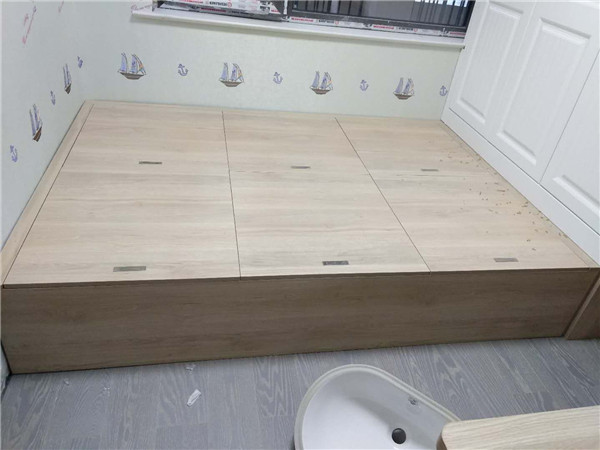 榻榻米板材使用平安樹富貴灰橡色實木多層板制作,酒柜板材使用平安樹小花胡桃色實木多層板制作。