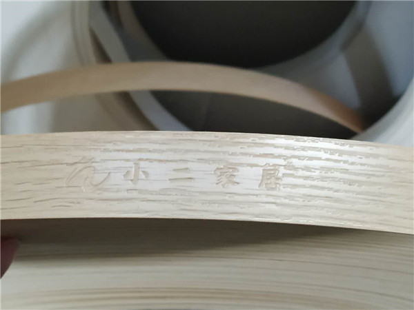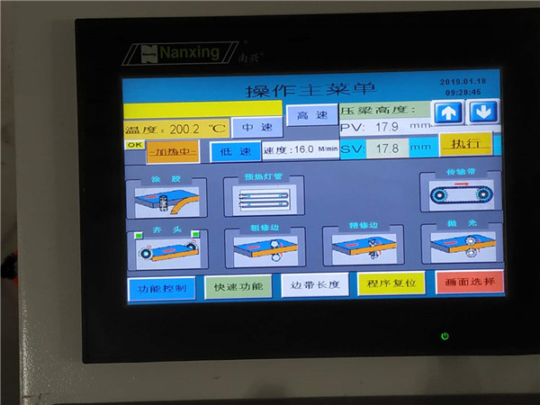 封邊使用專門的機器封邊哦,機器溫度到達200℃就可以封邊啦,現在在預熱中,封邊使用進口法國波士熱熔顆粒膠,封邊條上印有小二家居的logo。