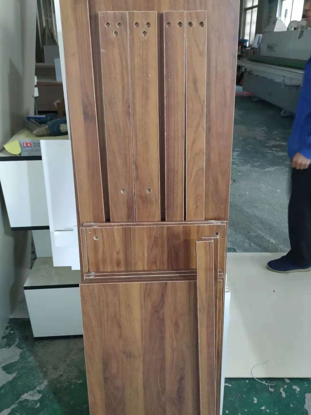 開始制作啦,櫥柜板材和小鞋柜板材打孔中,板材使用平安樹實木多層板制作,柜體顏色是鴻運當頭,門板是雙飾面暖白色哦。