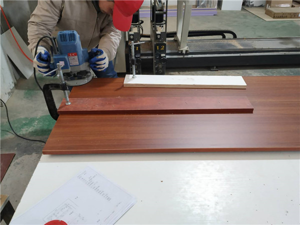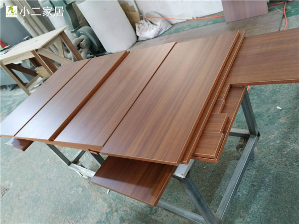 開始制作啦,紅棕色的板材是平安樹柚木色實木多層板,用來制作書桌和門板,板材已經封好邊啦,下一步要打孔了,