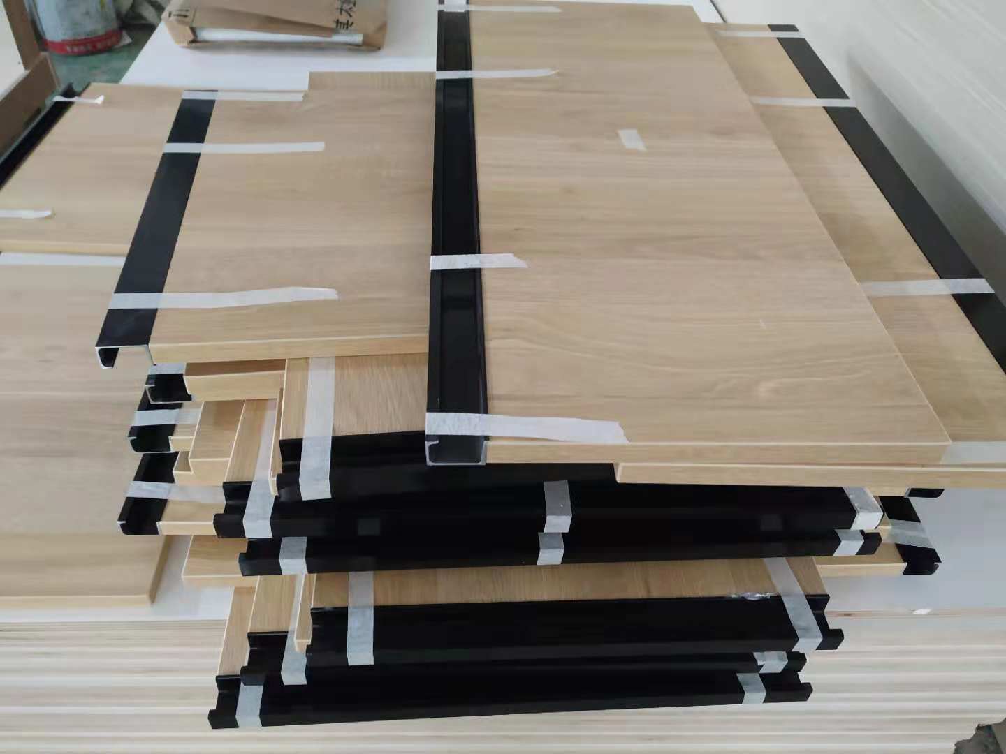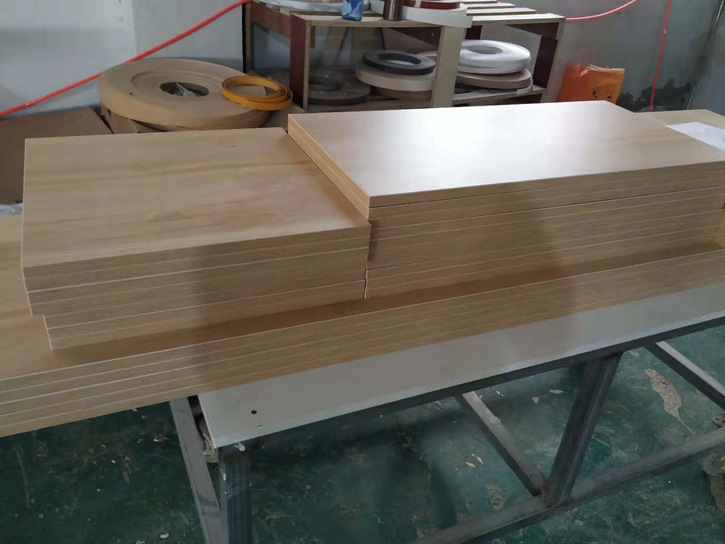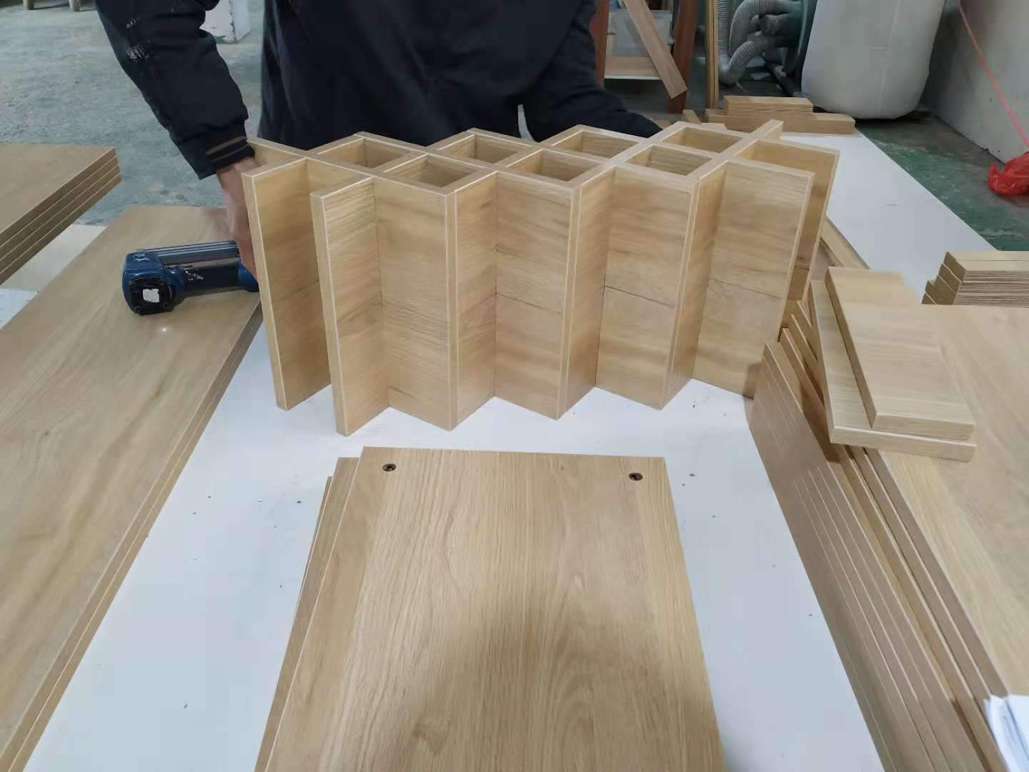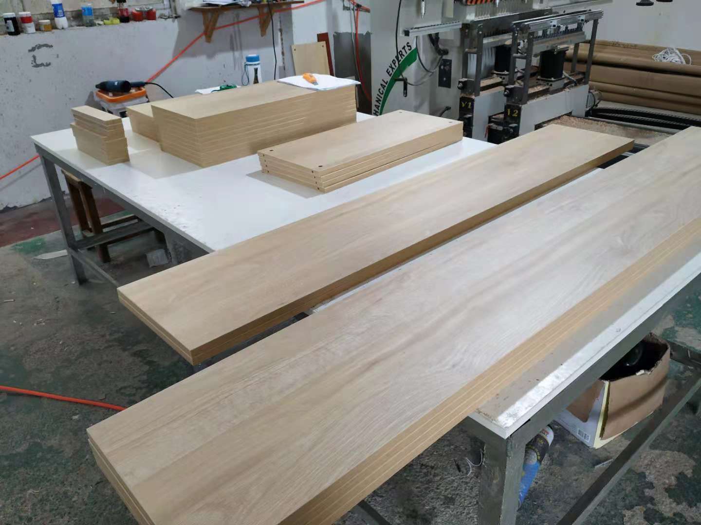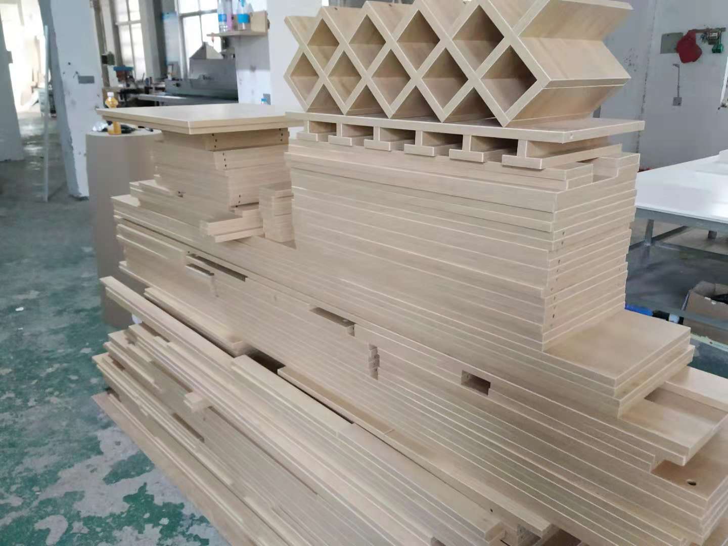 開始制作啦,櫥柜板封邊打孔完畢,隔斷柜板材打孔中,酒柜酒格制作中,其余板材封邊中。