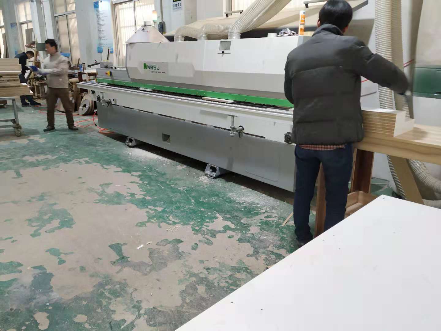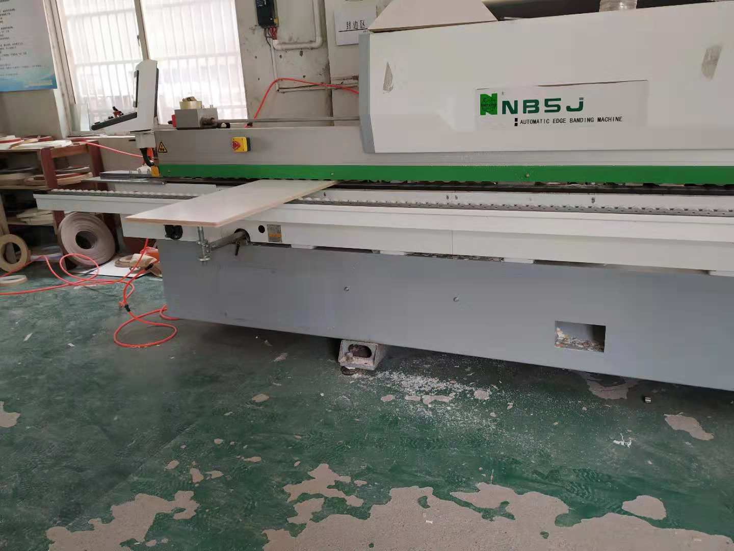 開始制作啦!櫥柜板封邊中,板材使用平安樹暖白色實木多層板制作。