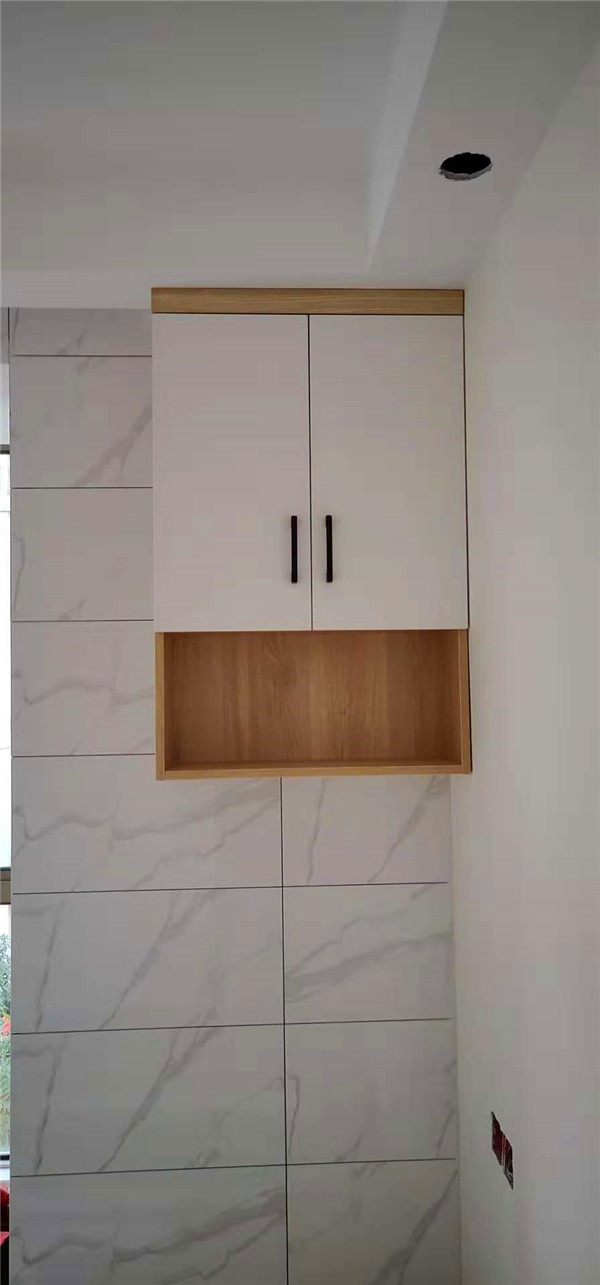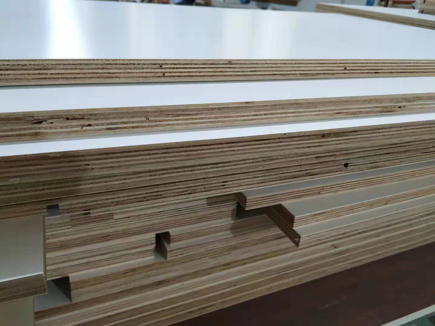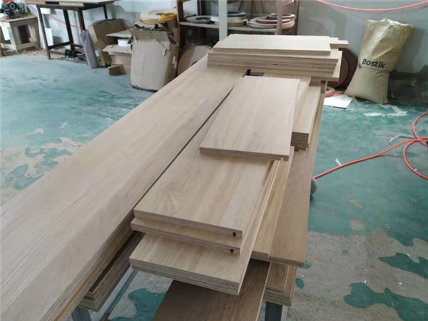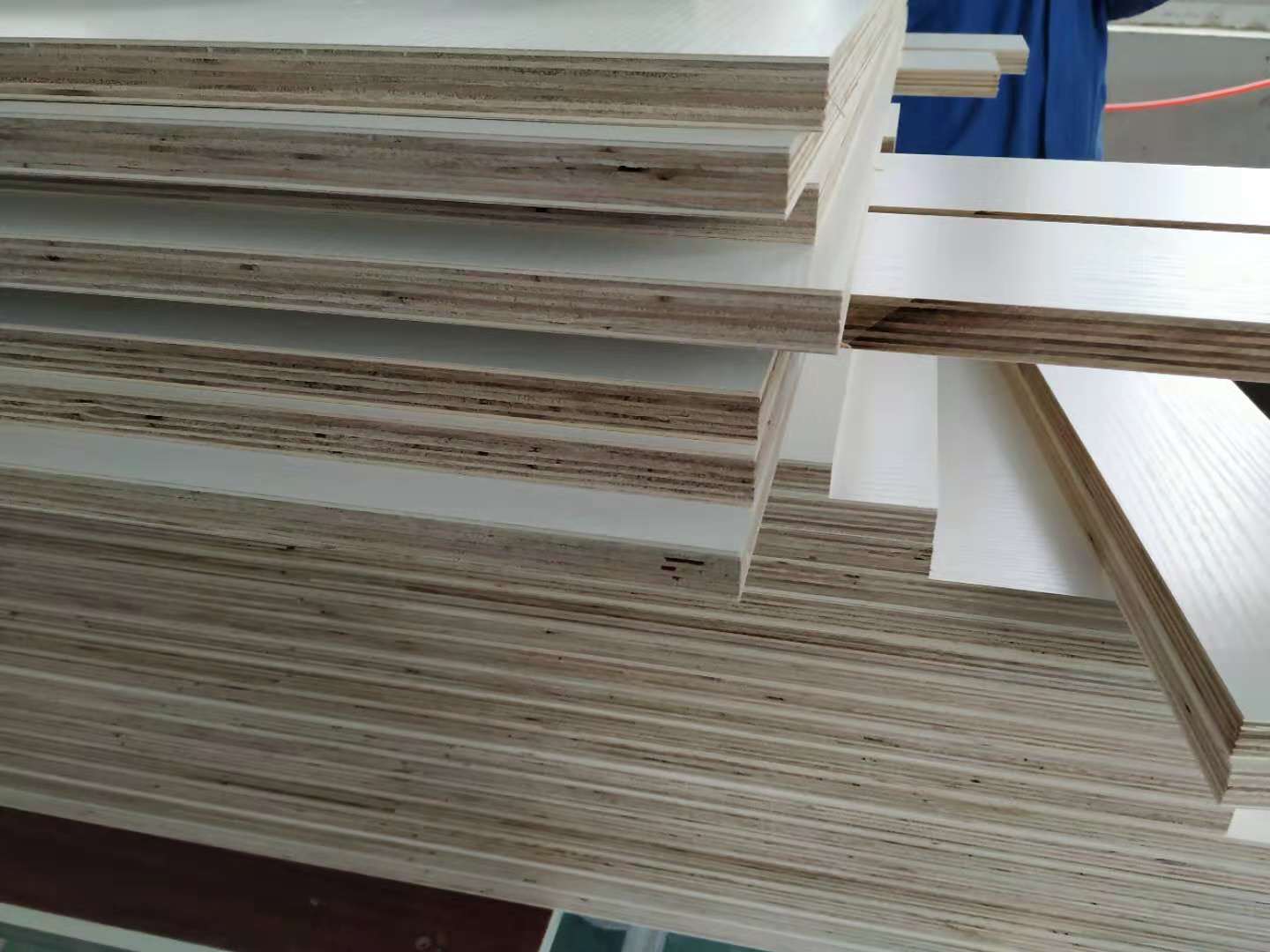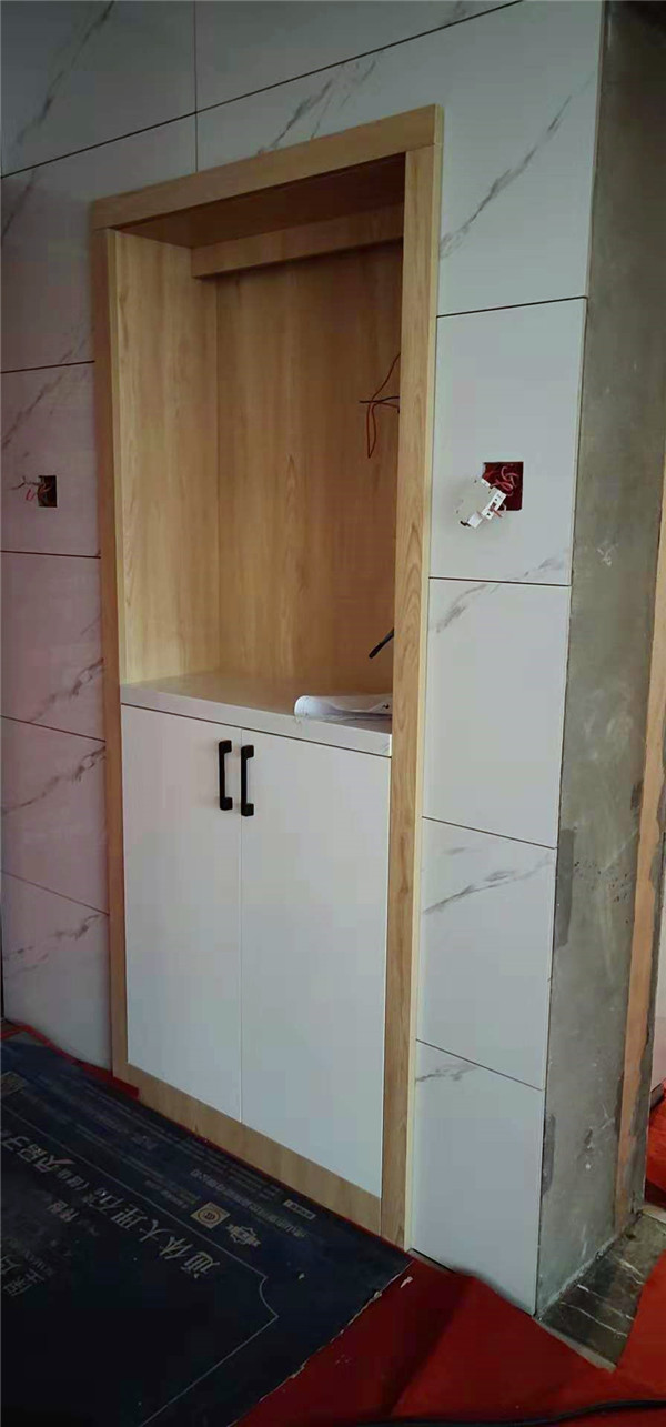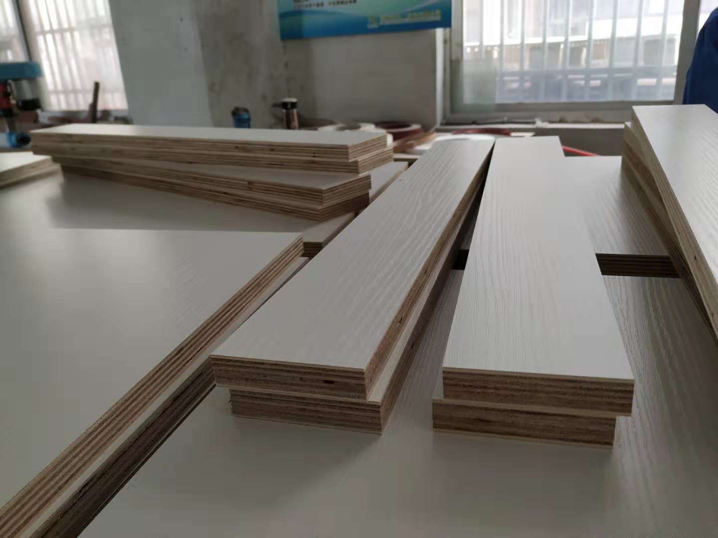 已經(jīng)裁好了待封邊的板材是制作廚房小柜子和車庫吊柜的板材,板材是平安樹仿古布紋色實木多層板制作的。