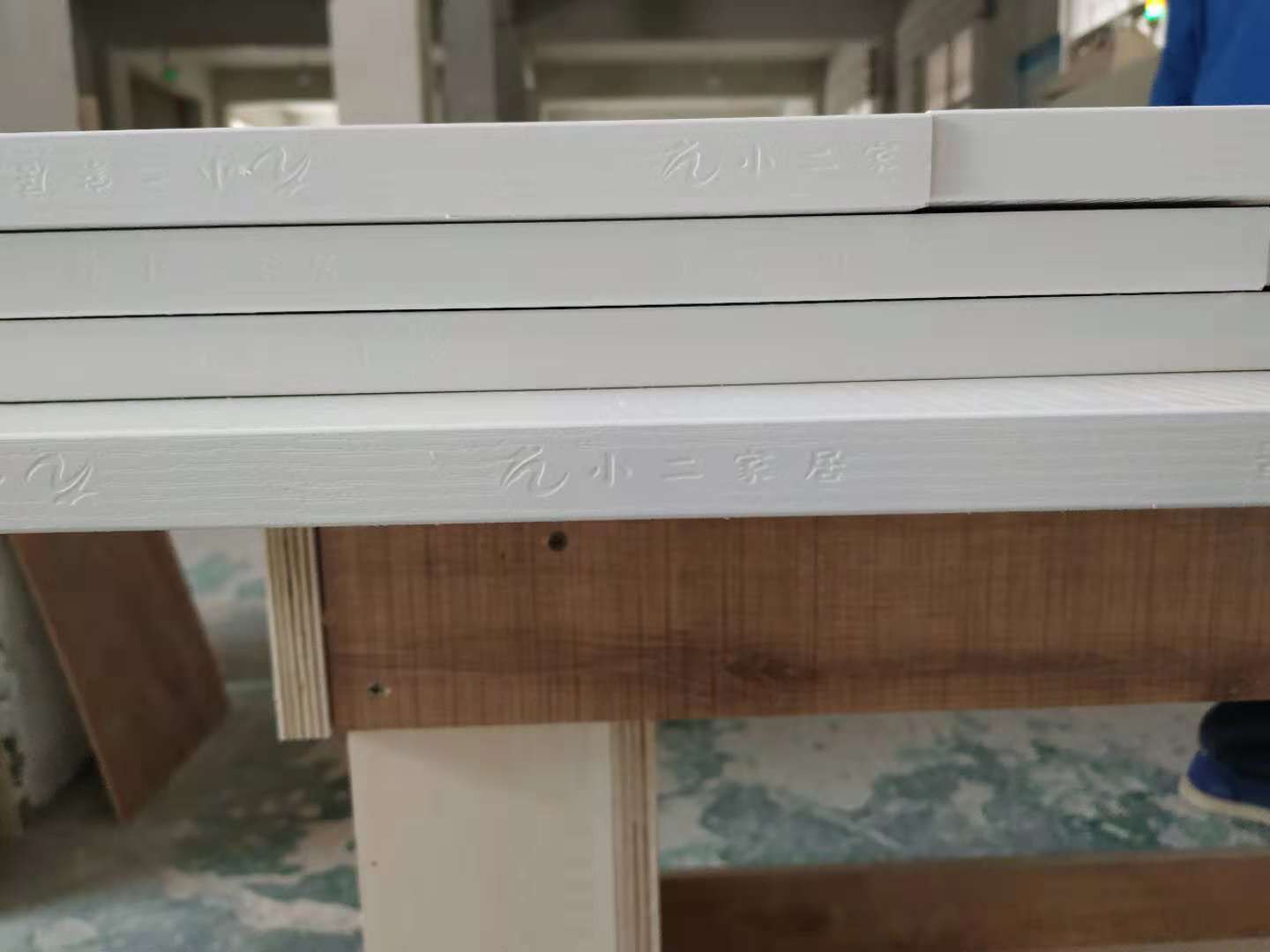 封邊使用的是熱熔顆粒膠,封邊條上印有小二家居的logo!圖7是待打孔的門板板材。