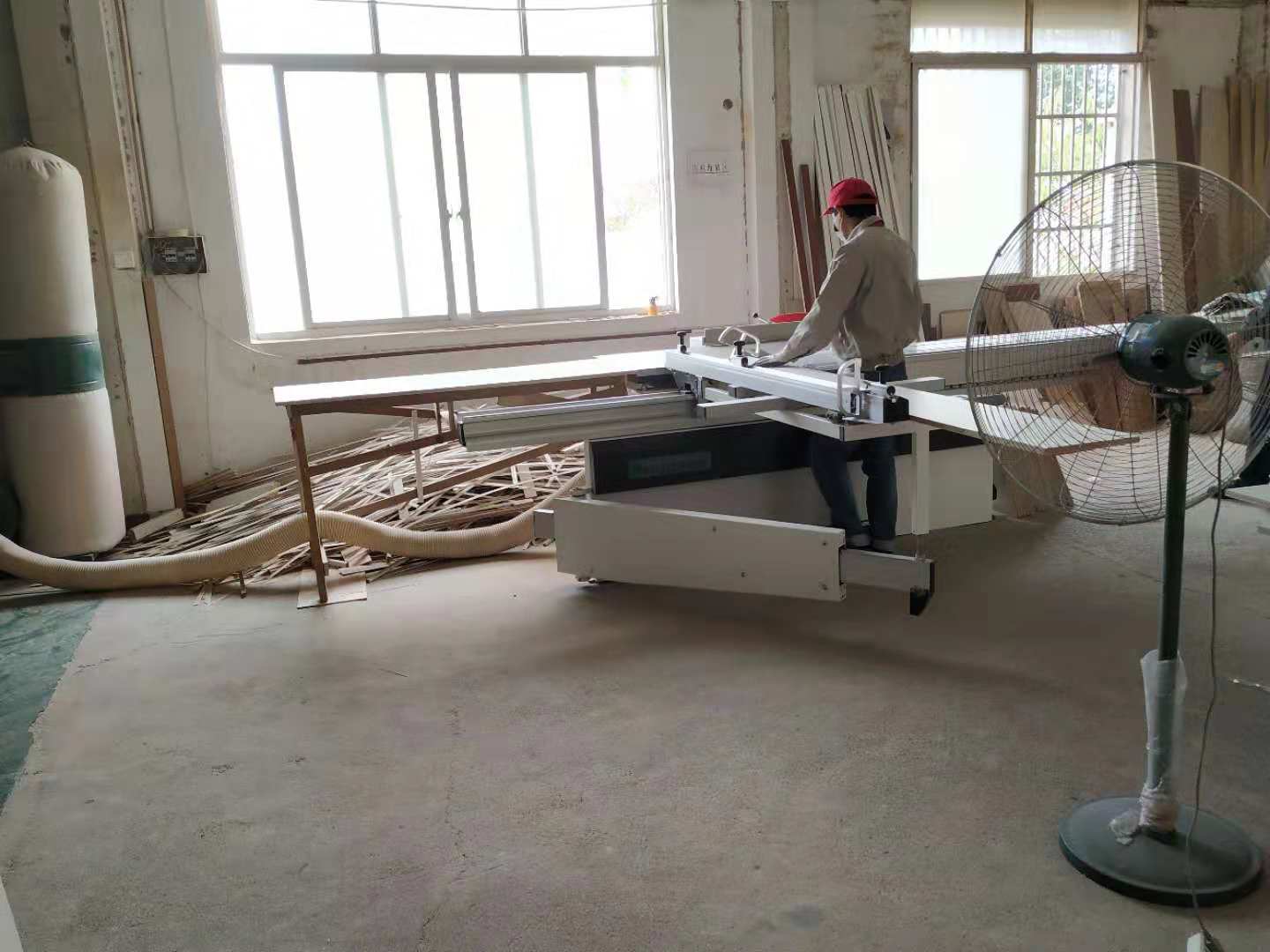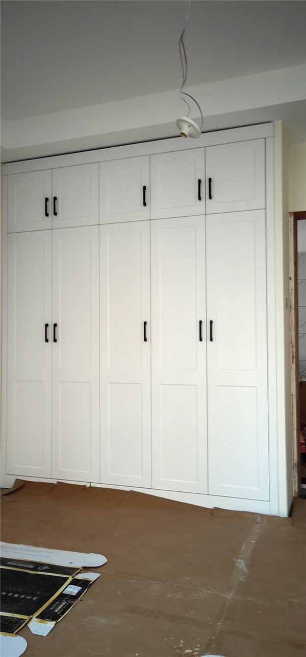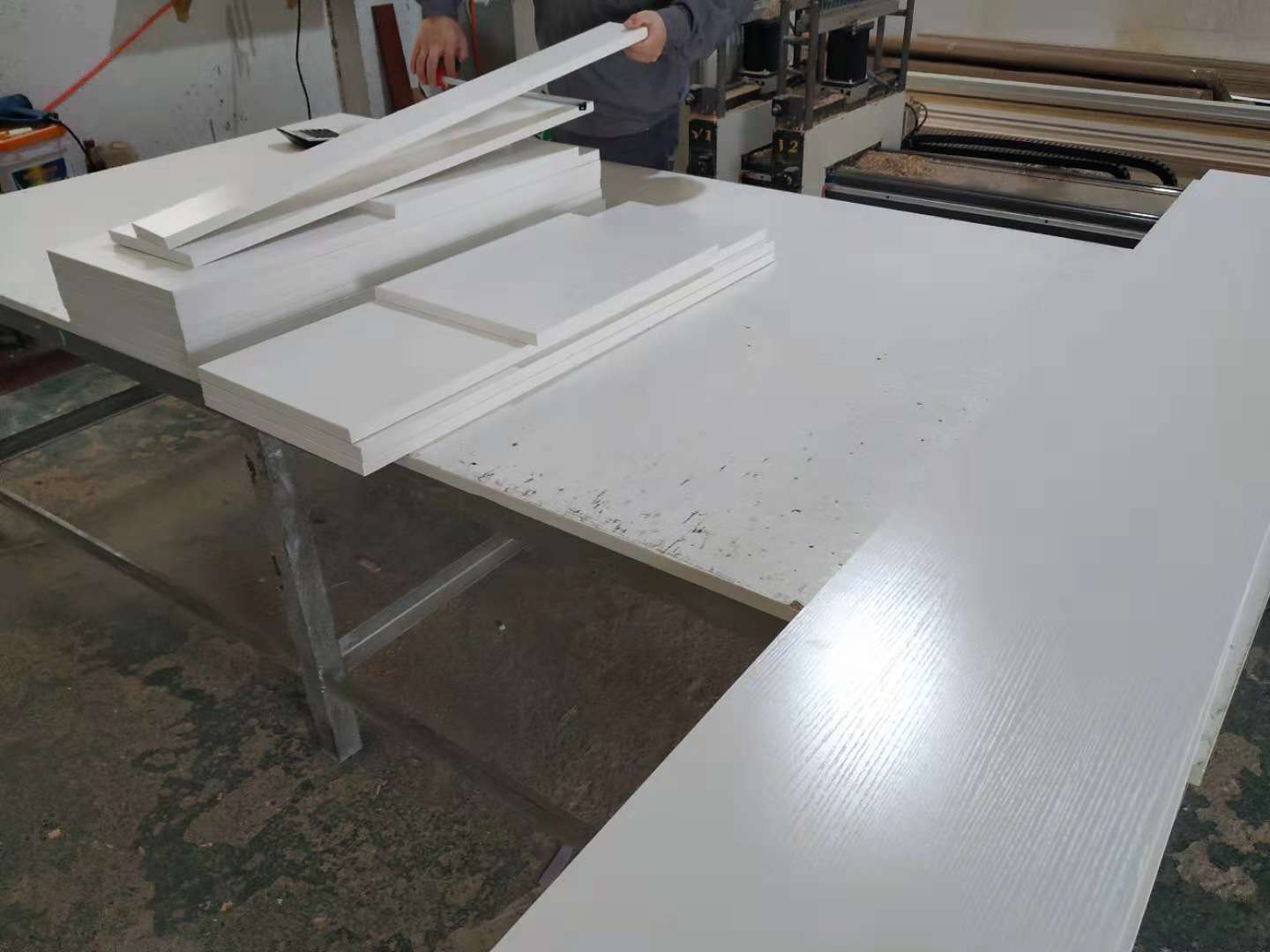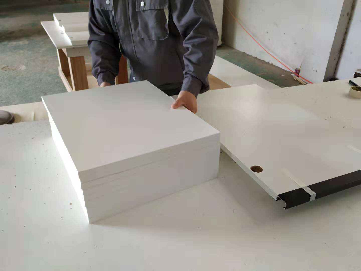 鞋柜和衣柜板裁板封邊中,板材使用平安樹暖白色實木多層板制作。