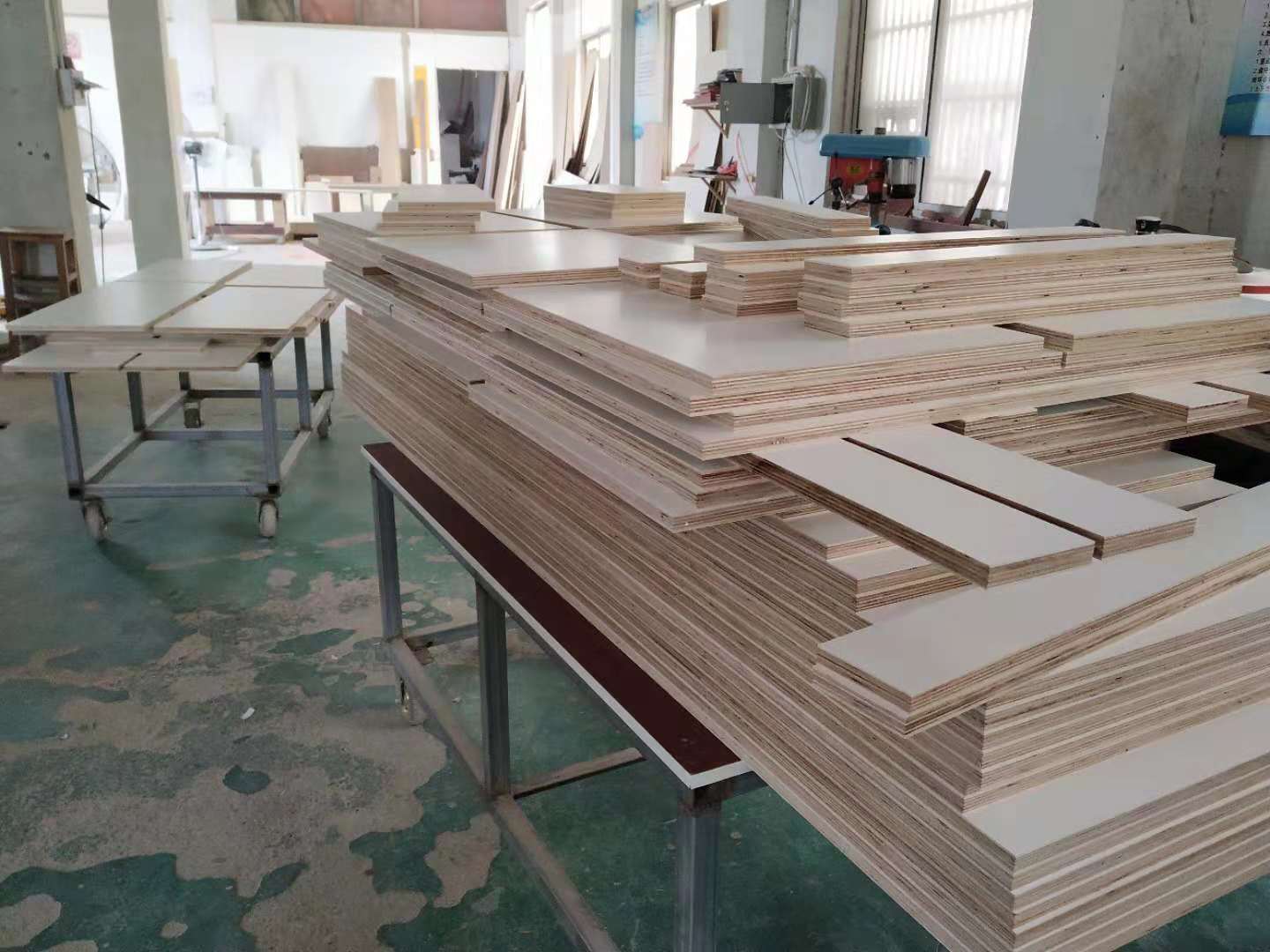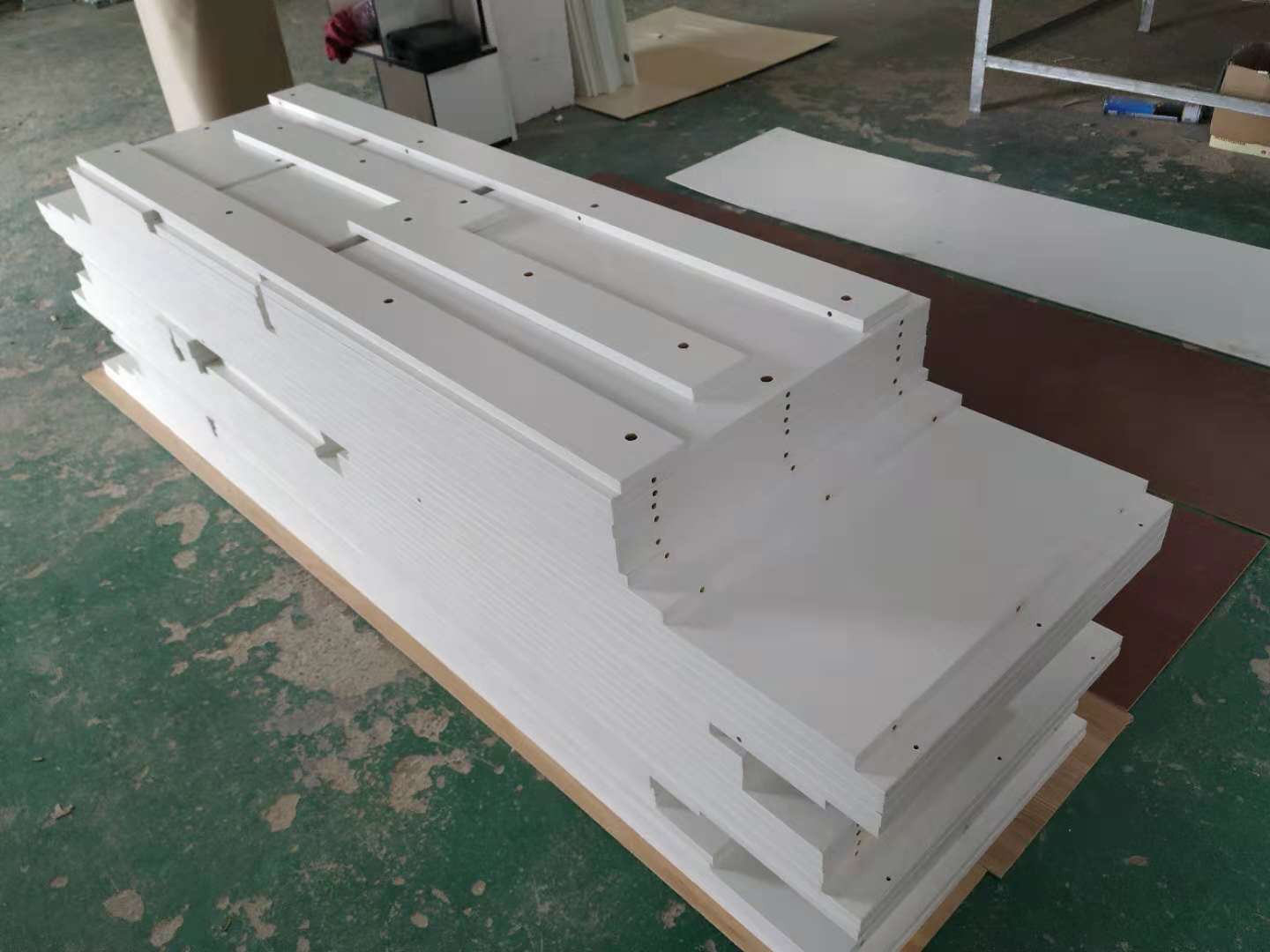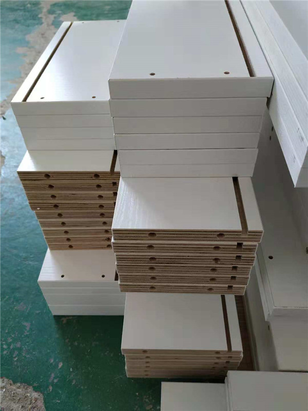 圖1是制作抽屜抽面的板材,圖2圖3是是封好邊打好孔的廚房小柜子和車庫吊柜的板材。